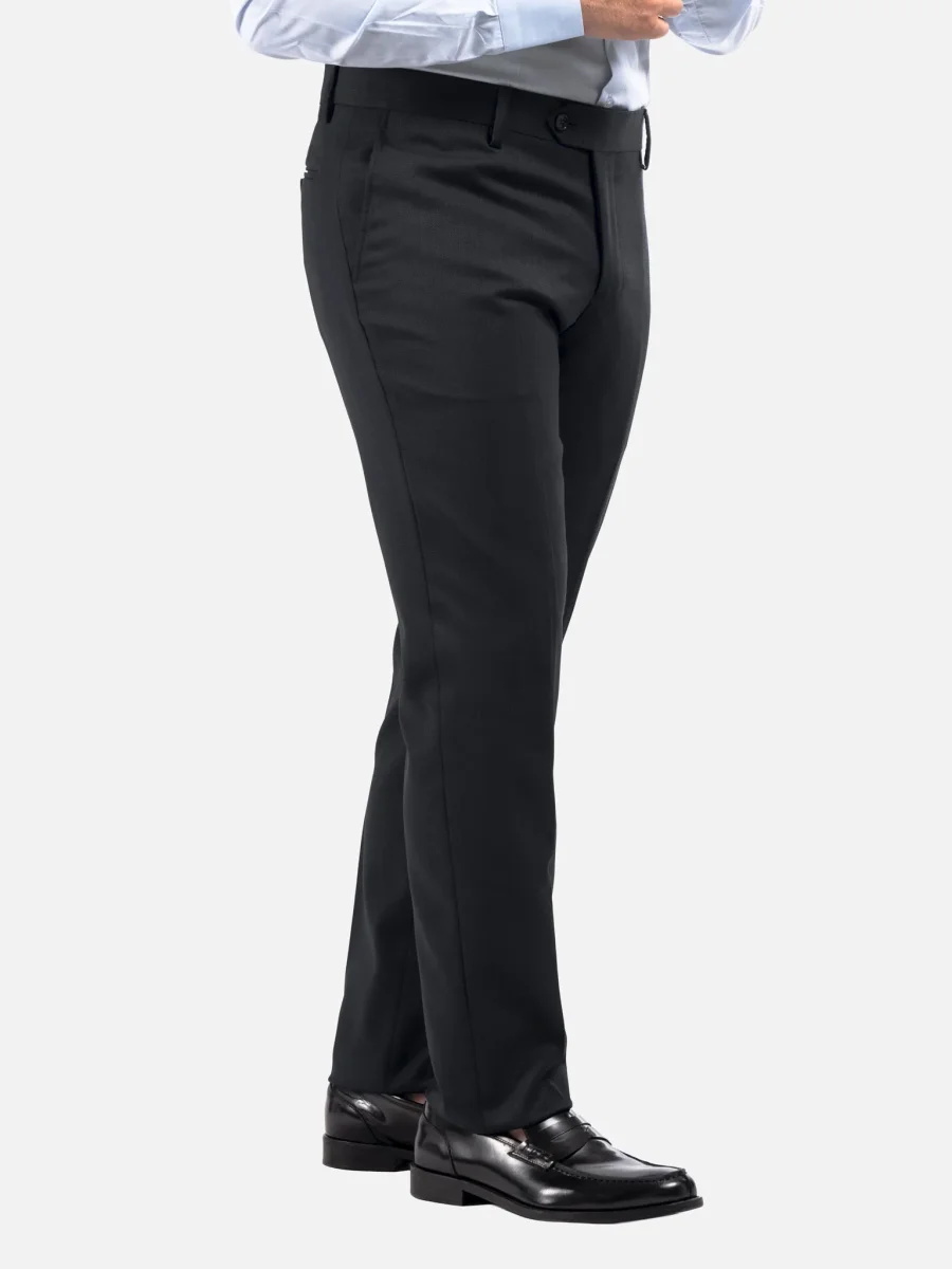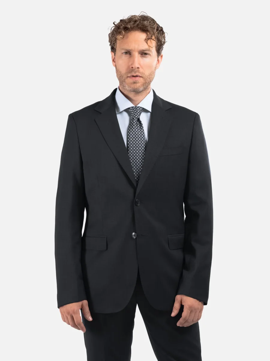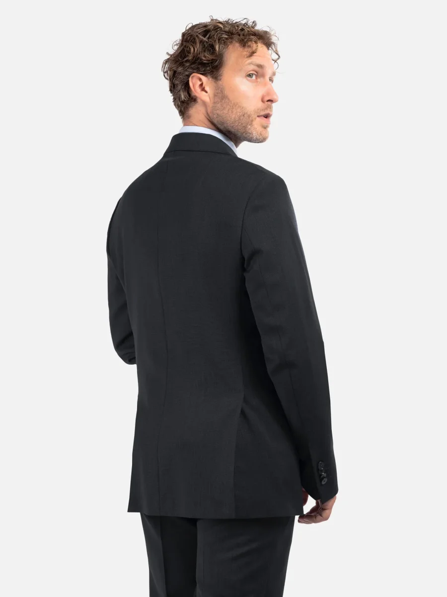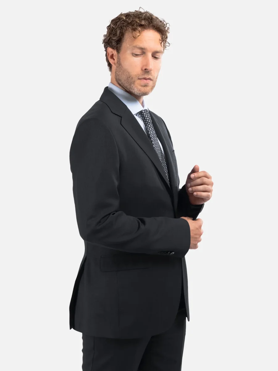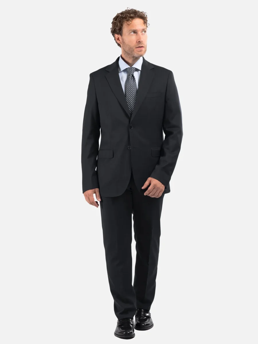Abito sartoriale in lana nero, ideale per un utilizzo trasversale durante tutto l’anno grazie al peso medio del tessuto e alla sua trama twill, che dona un aspetto compatto e raffinato con una mano naturalmente elastica e confortevole. La costruzione semi intelata e la linea pulita lo rendono perfetto per il contesto business e cerimonie formali. La giacca presenta spalle leggermente strutturate, rever classico, chiusura a due bottoni e doppio spacco posteriore per una vestibilità equilibrata. I pantaloni abbinati seguono una linea asciutta con piega centrale stirata, tasche laterali e tasche posteriori a filetto.