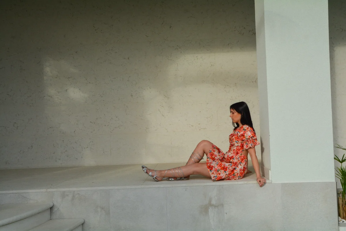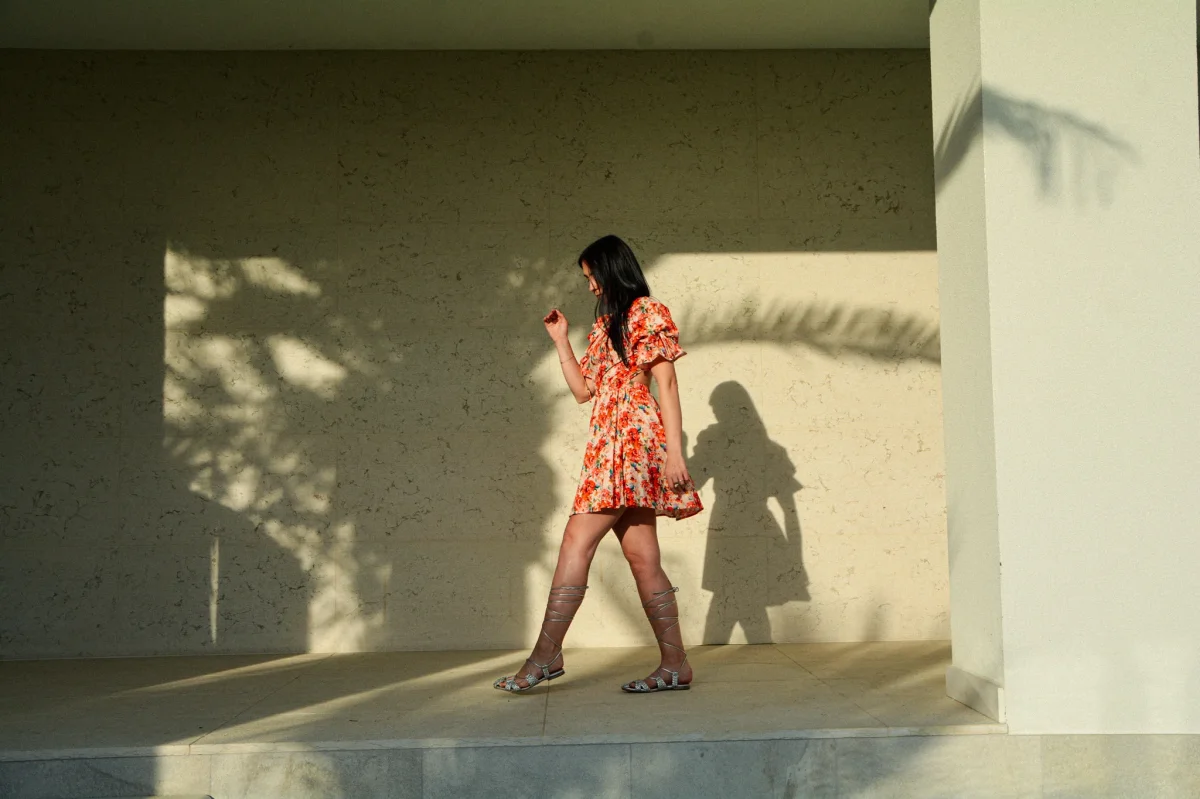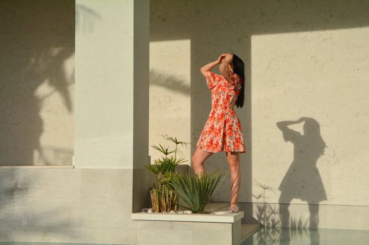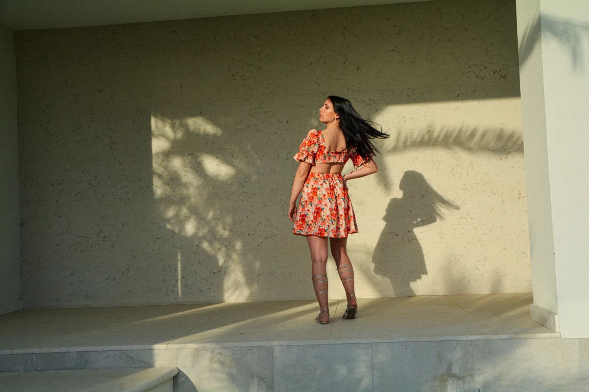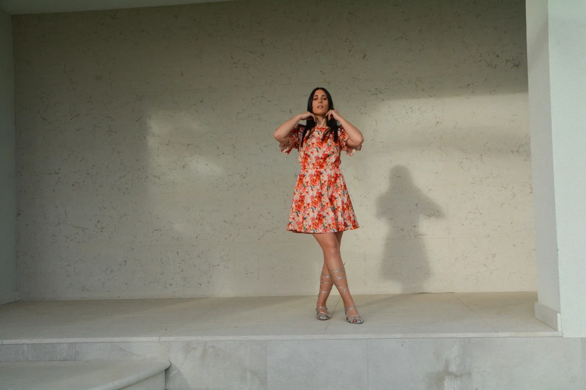 Abito corto fiorato Frivolité con dettaglio cut out sulla schiena. La modella è alta 1.62 e indossa la taglia 40. Made in Italy 100% cotone