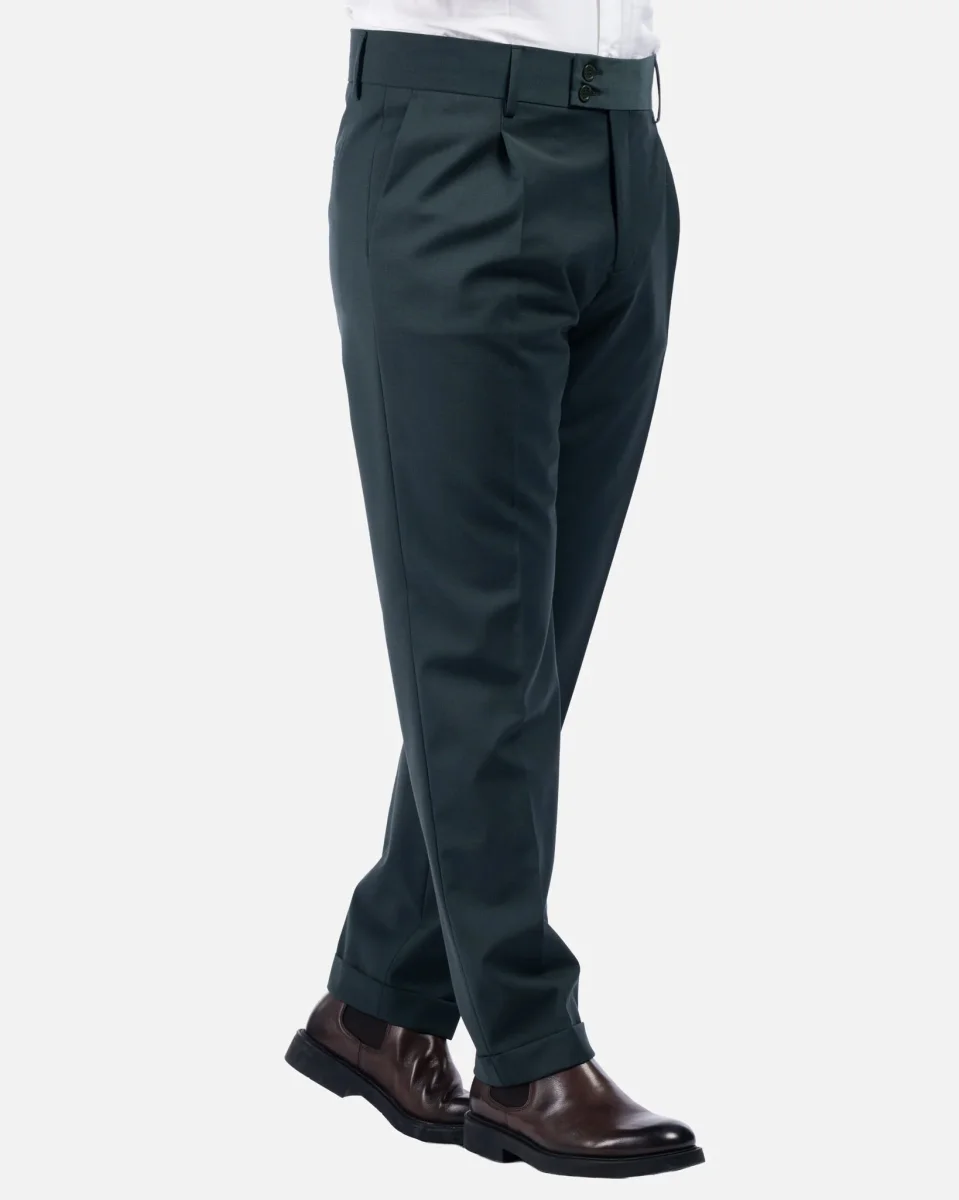 – Pantalone con pinces, passanti per cintura e chiusura con doppio bottone