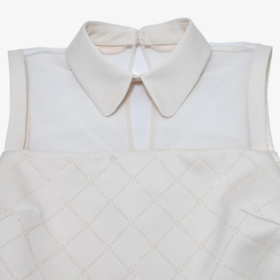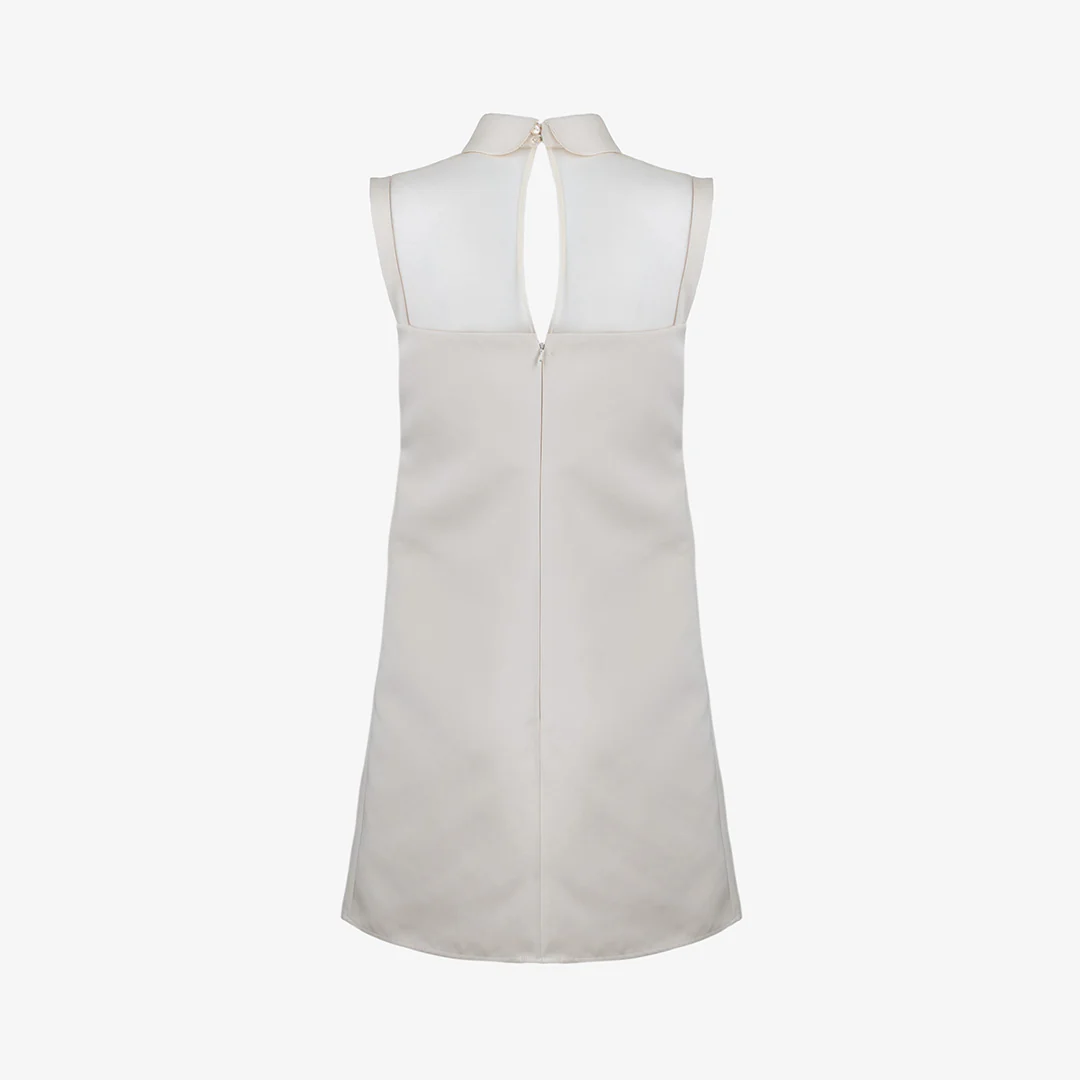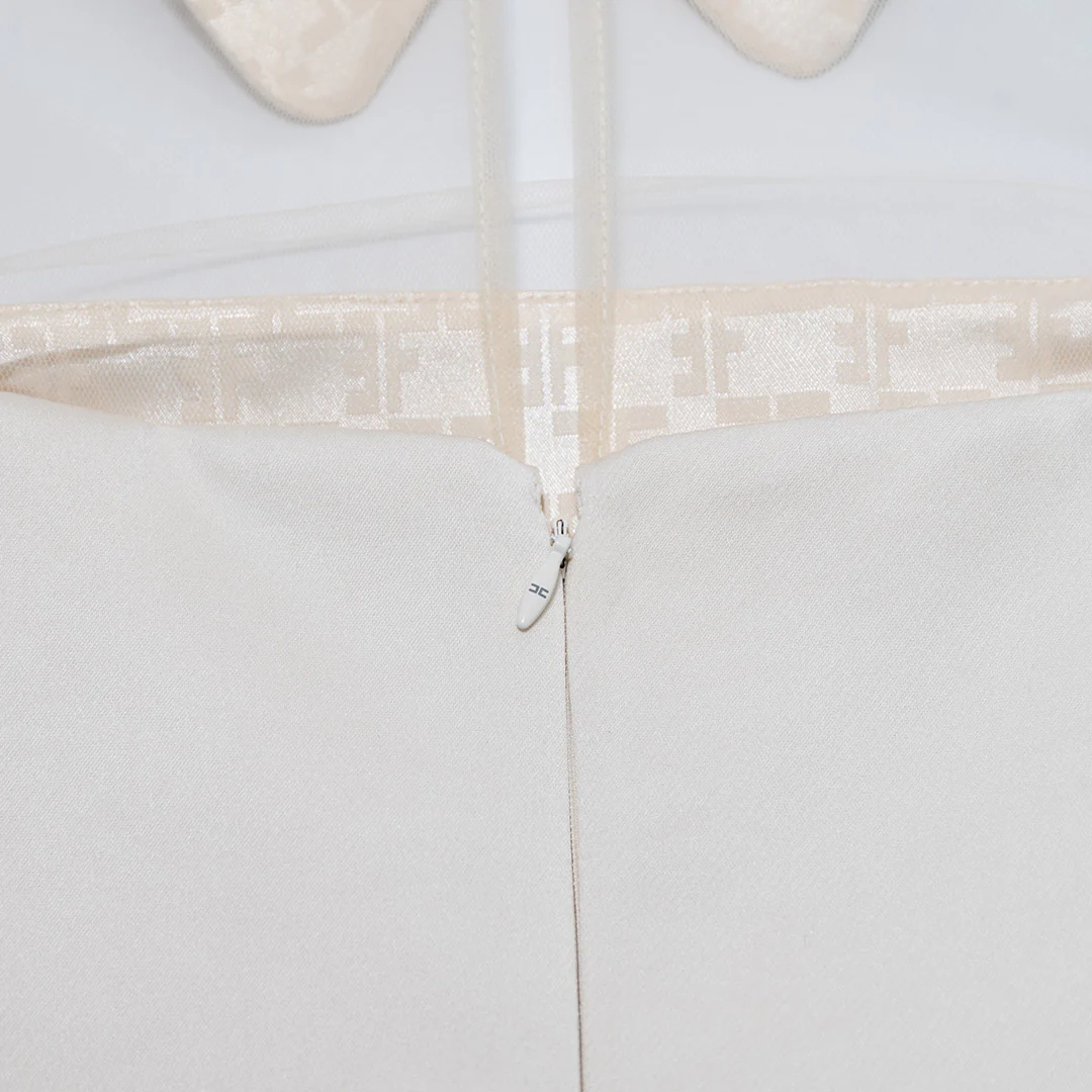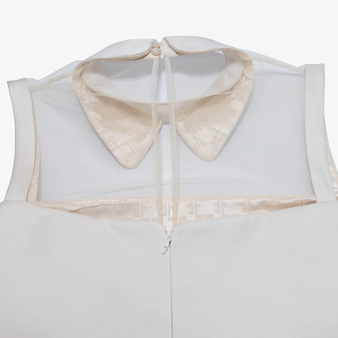 Chiusura posteriore con bottoni e cerniera nascosta nella cucitura.