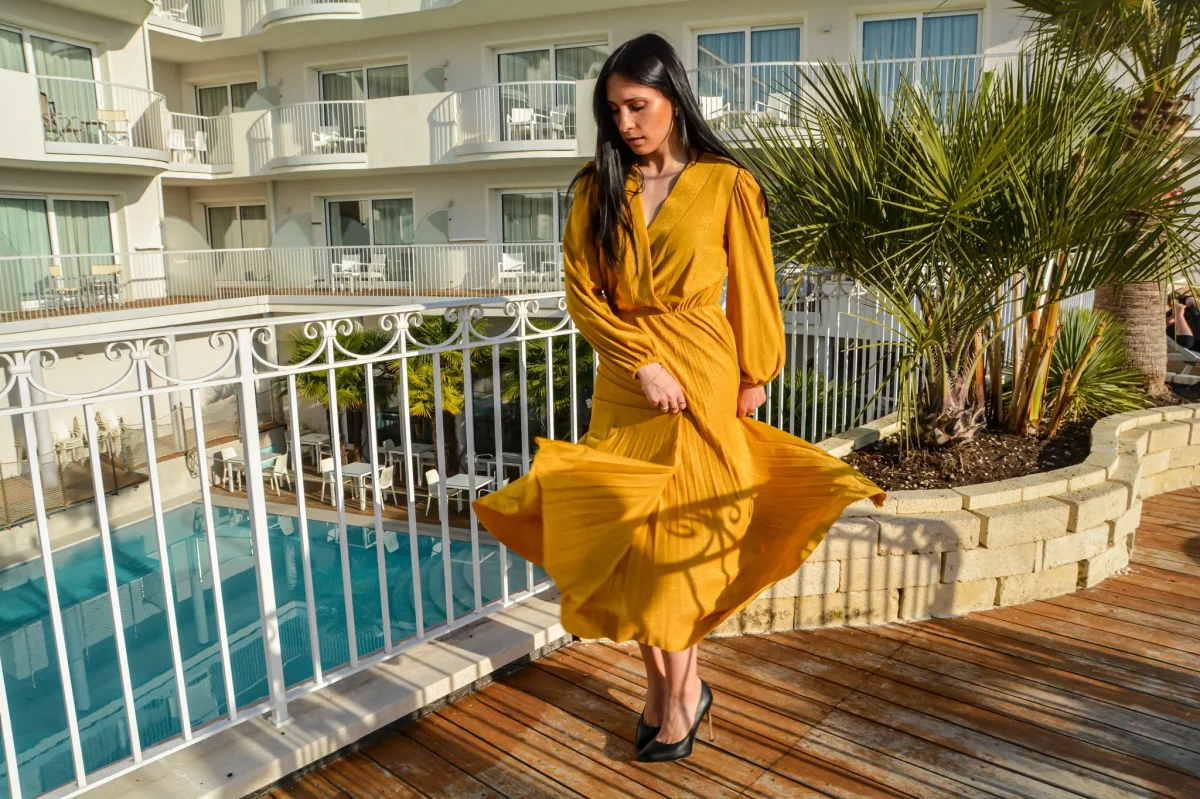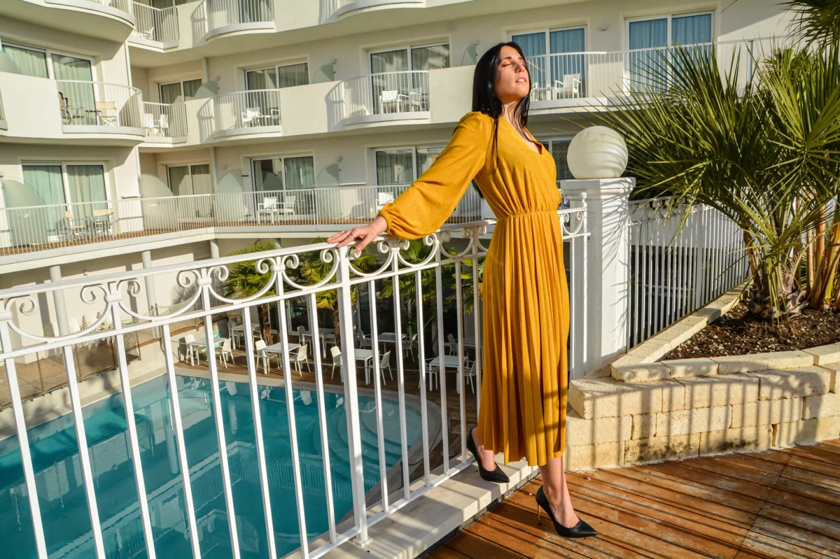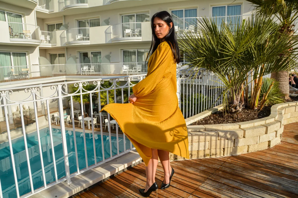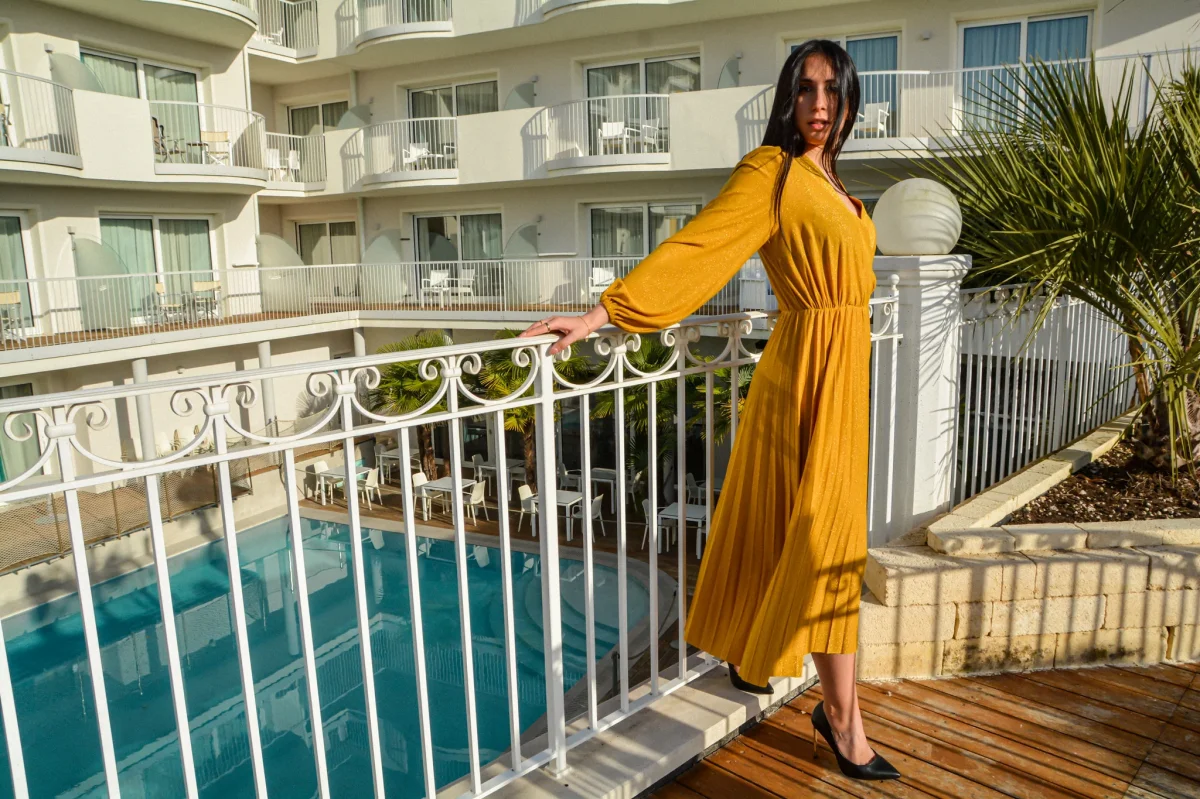 Abito lungo plissettato Frivolité, tessuto lurex color oro. La modella è alta 1.62 e veste la taglia 40. Made in Italy Composizione: 65% viscosa 18% poliestere 12% poliammide 5% elastan
