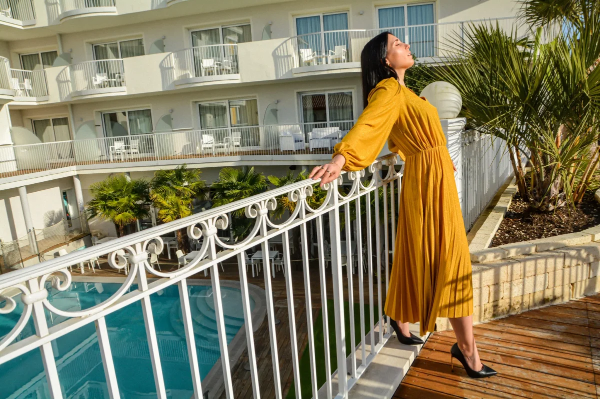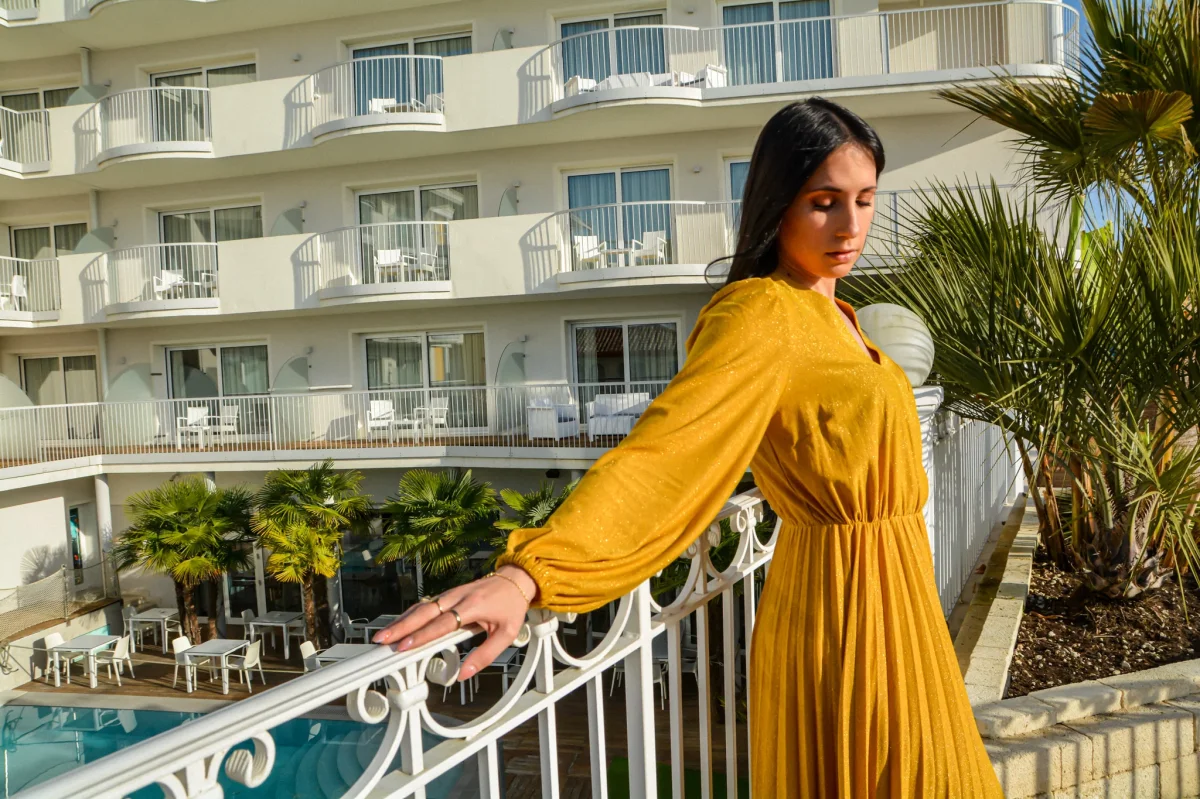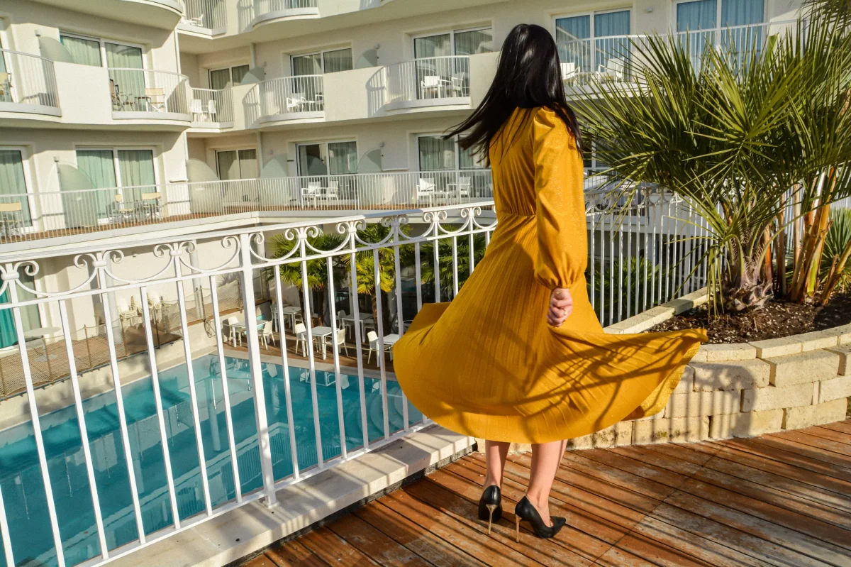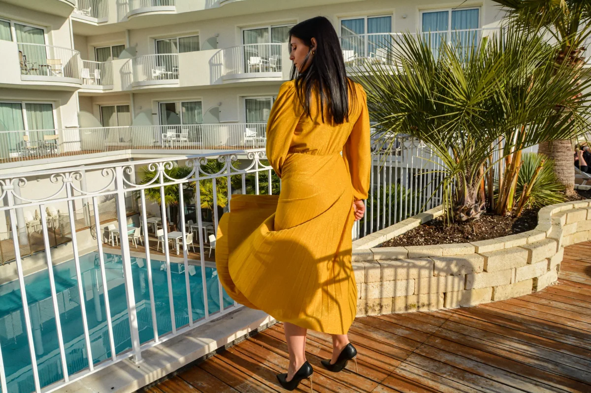 Abito lungo plissettato Frivolité, tessuto lurex color oro. La modella è alta 1.62 e veste la taglia 40. Made in Italy Composizione: 65% viscosa 18% poliestere 12% poliammide 5% elastan