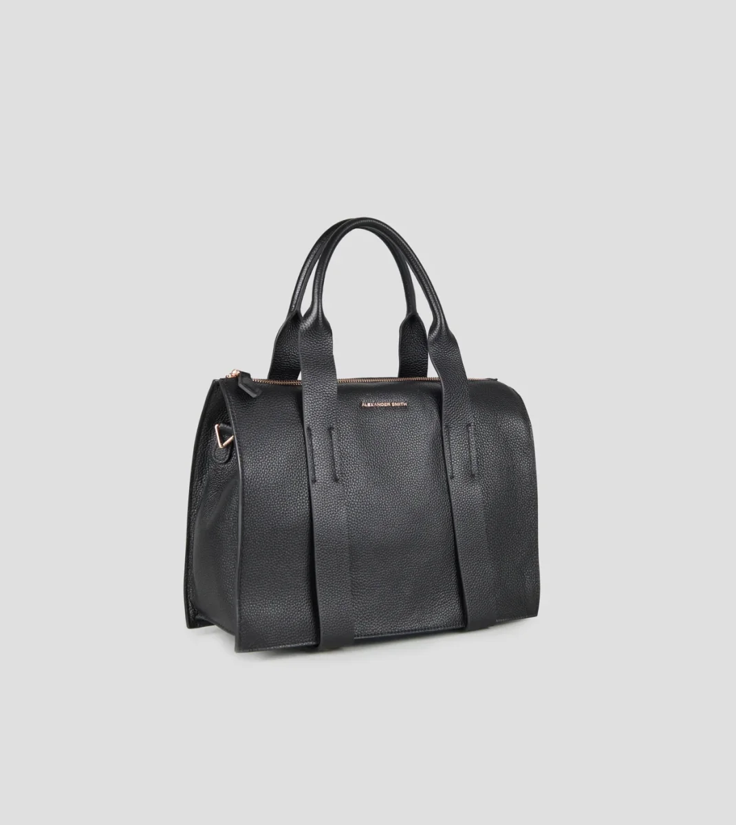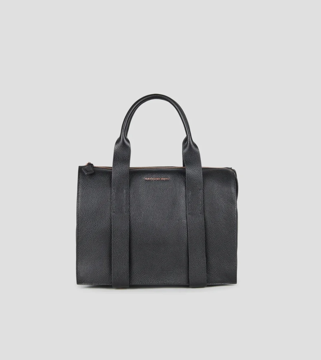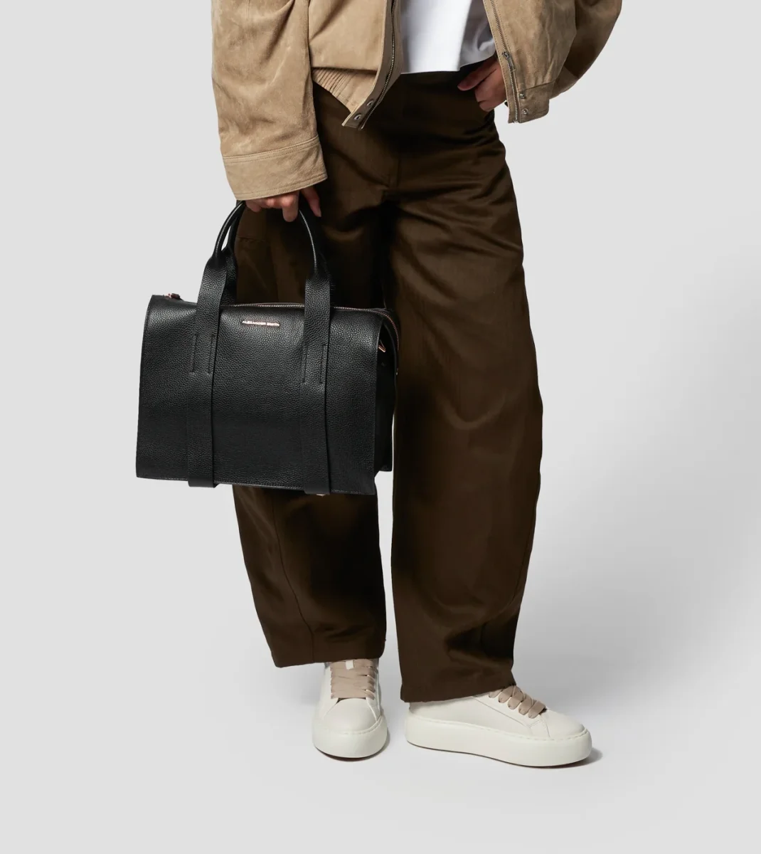 Bauletto di medie dimensioni realizzato in morbida pelle di vitello pieno fiore. L’articolo ha due comodi manici piu’ la tracolla lunga a nastro regolabile e removibile. Le linee essenziali e pulite danno un’identita’ stilistica ben precisa alla borsa. Logo e rifiniture metalliche in color rame. DIMENSIONI: 32x25x13 cm COLORE: NERO