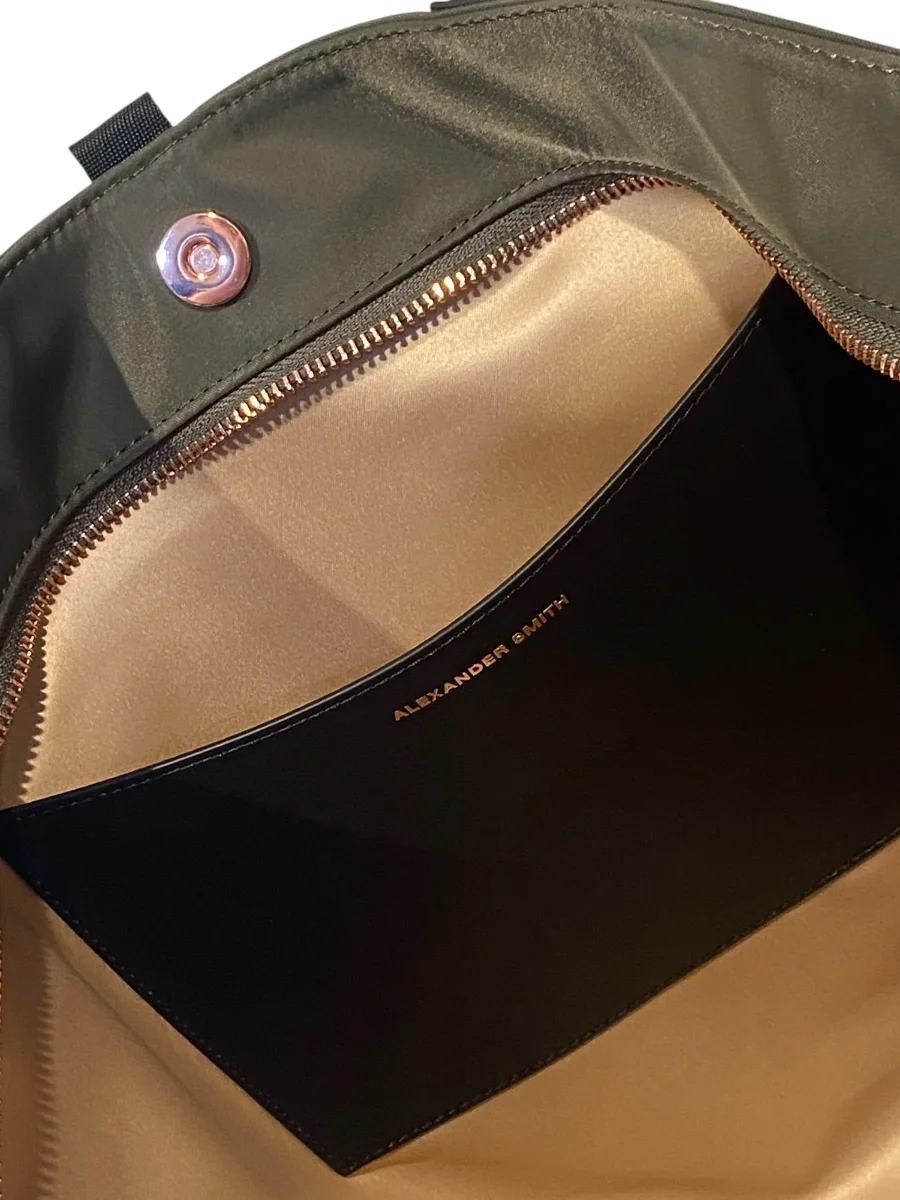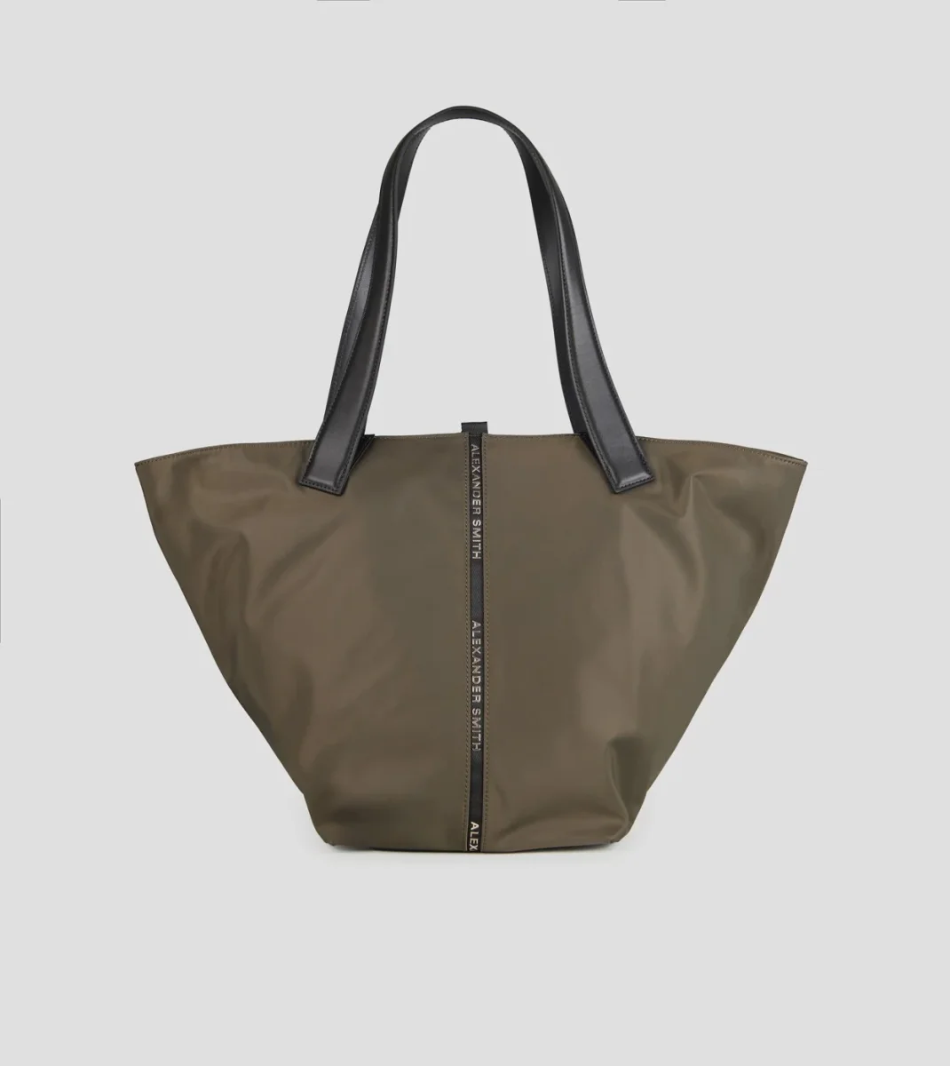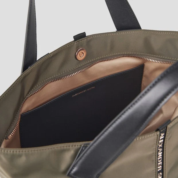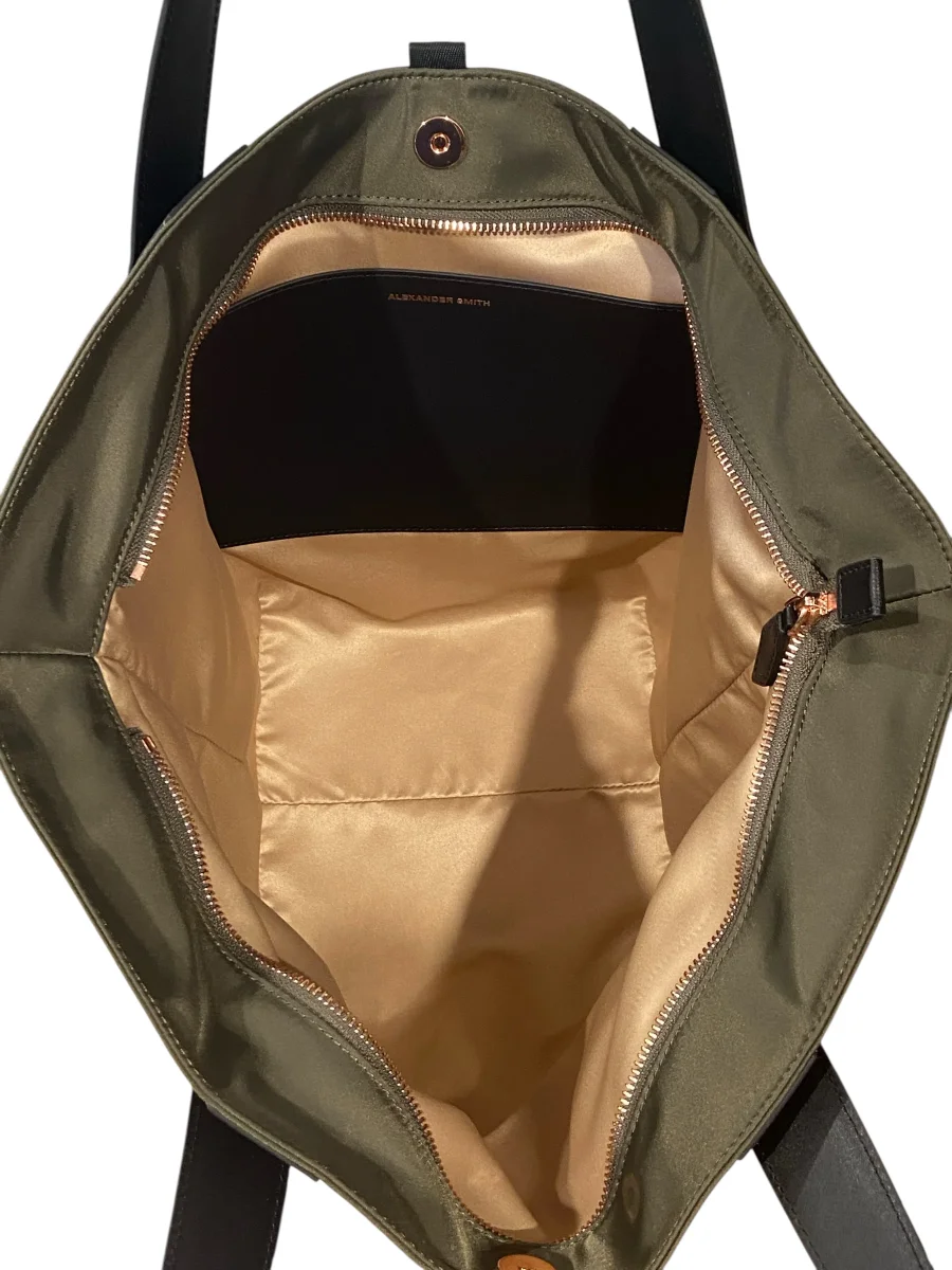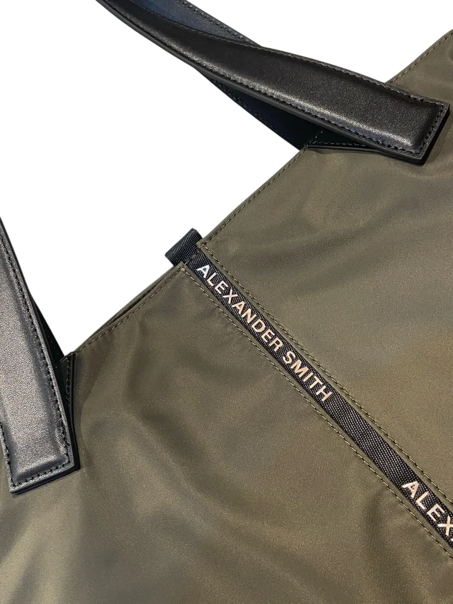 Borsa di grandi dimensioni a forma trapezio, realizzata in resistente e leggero nylon spalmato con manici in pelle in contrasto di colore. Chiusura con cerniera lampo piu’ calamita centrale. All’interno fodera in raso e pratica tasca porta oggetti. Gli accessori metallici sono in color oro rosa tipico segno distintivo del brand.