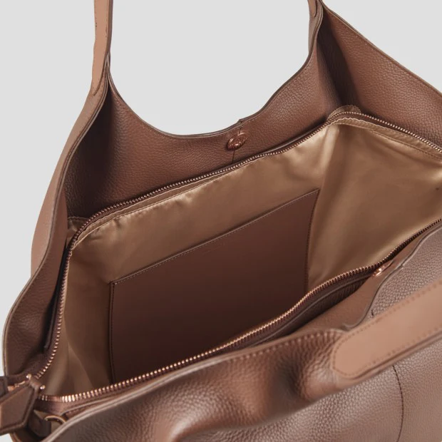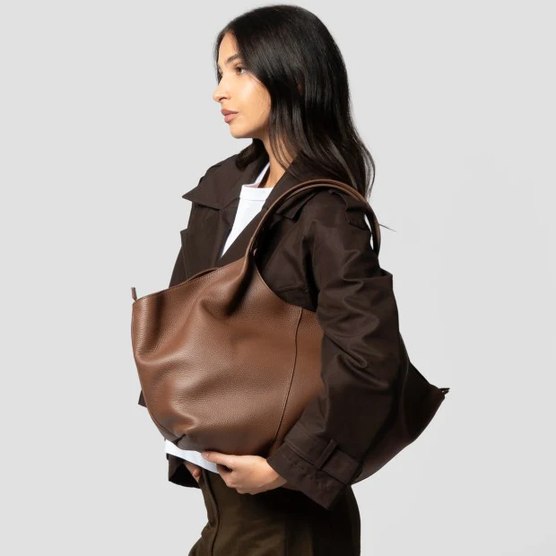 Borsa di grandi dimensioni realizzata in morbida pelle di vitello pieno fiore. L’articolo ha due comodi manici che consentono la perfetta indossabilita’ sotto spalla. E’ possibile cambiare il modello della borsa (riducendone anche le dimensioni) tramite laccetto con moschettone inserito all’interno.
