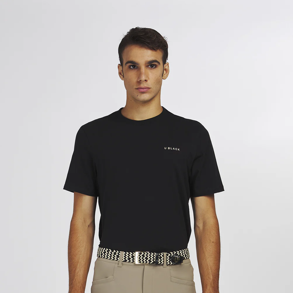 T-shirt classica girocollo a costina, manica corta realizzata in jersey di cotone con logo ricamato in filo color champagne sulla parte sinistra. Prodotta in Italia.