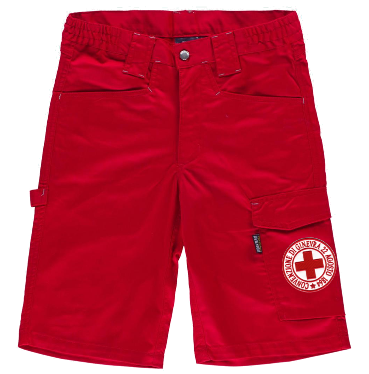Bermuda Croce Rossa Italiana multitasche con elastico e passanti in vita, chiusura di bottone automatico e patta di cerniera. Logo a ricamo su tasca.