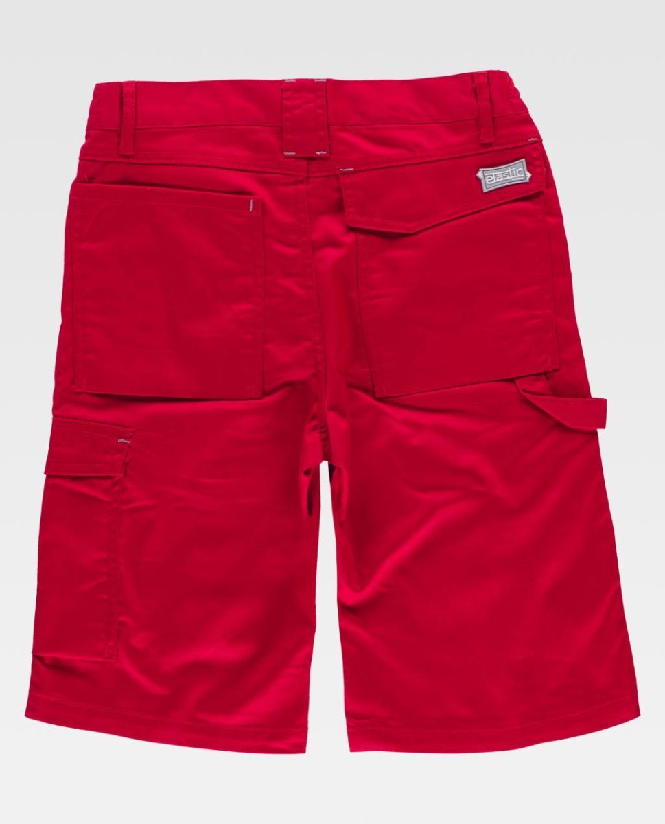 Pantalone corto con due tasche di apertura inclinata nei fianchi e una tasca laterale con pieghe inferiore e risvolto di velcro. Due tasche posteriori con pieghe inferiore, uno con risvolto di velcro e un’altra di spatola. Passante portamartello. Asole a contrasto. Elastico nei laterali della vita. Passanti di diverse dimensione. Chiusura di bottone automatico e patta di cerniera. Logo a ricamo su tasca.