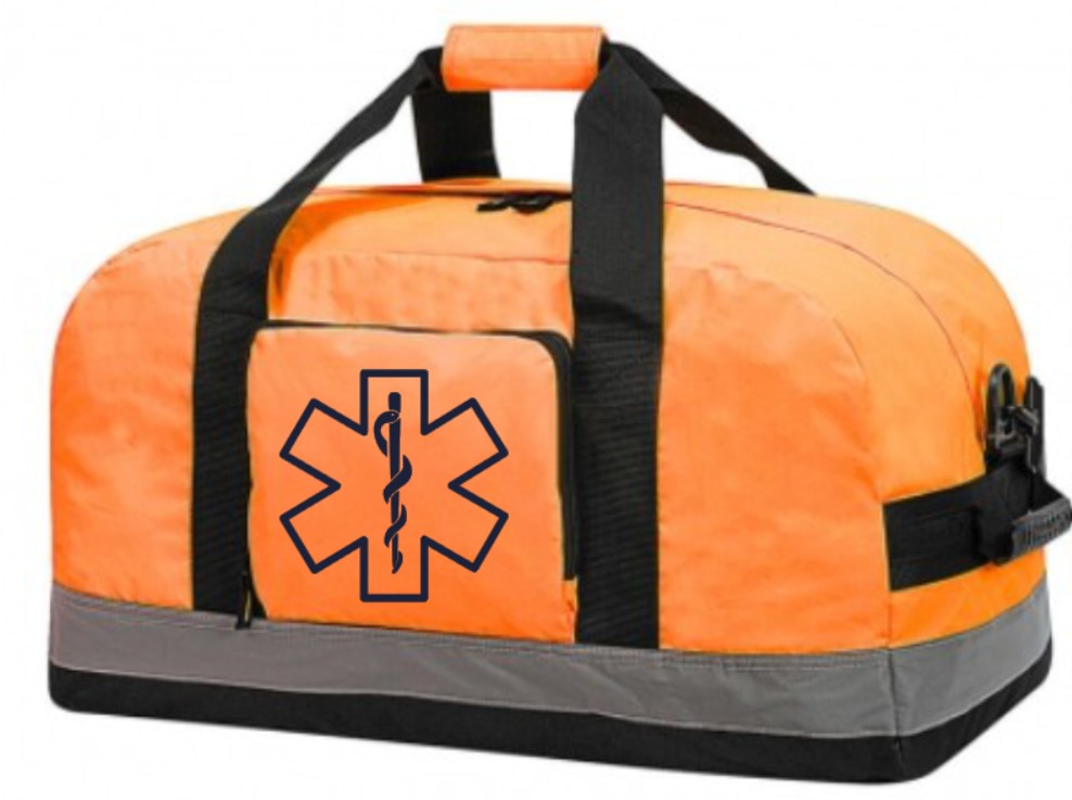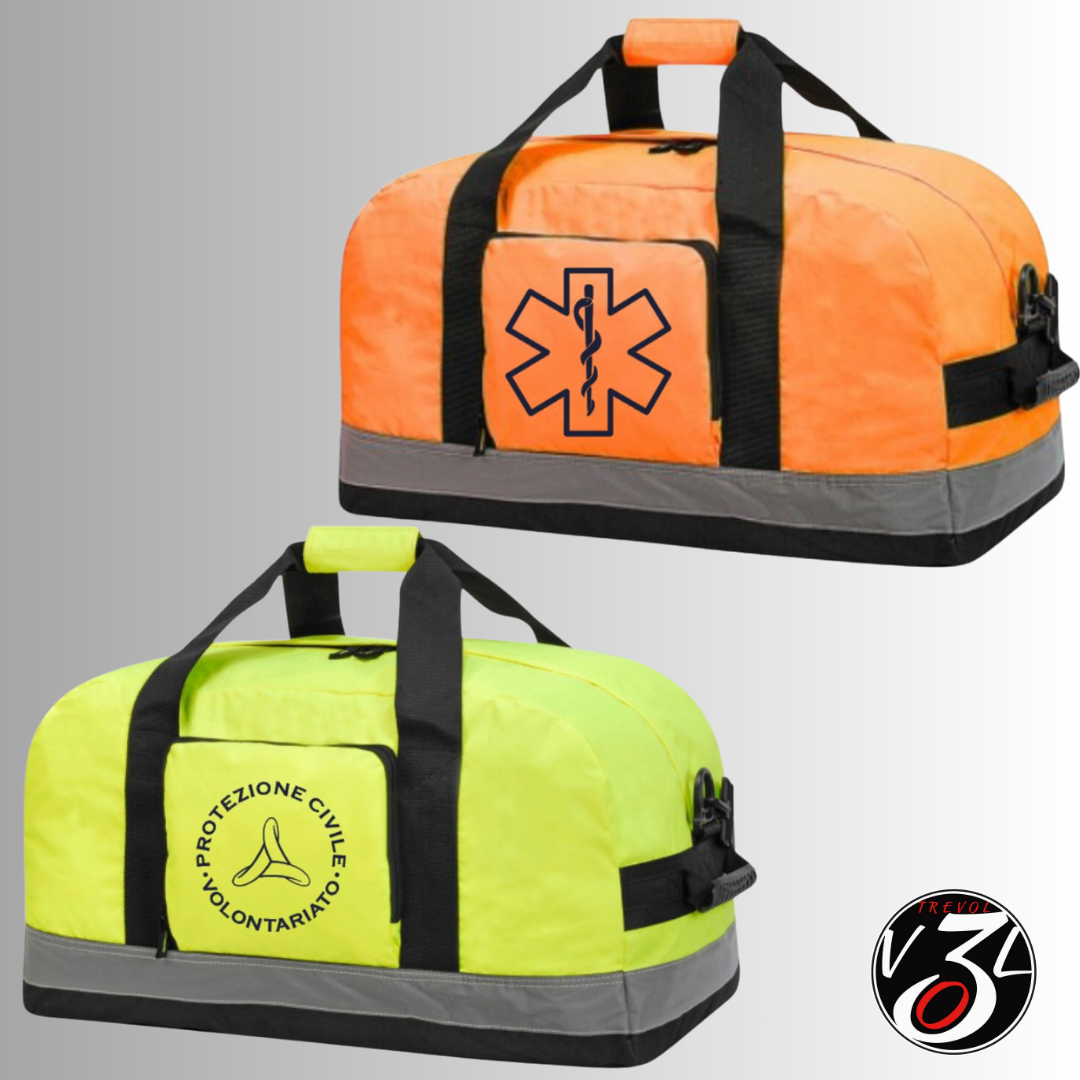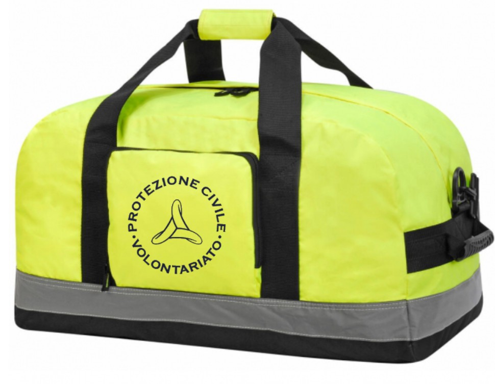 Borsone alta visibilità con tracolla imbottita regolabile e manici di trasporto e con maniglia imbottita su ciascuna estremità. Capacità: 50 Litri