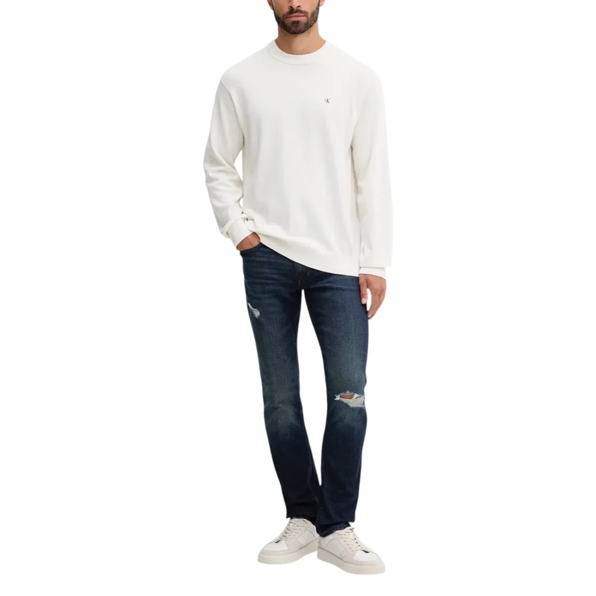 Calvin Klein Jeans Maglia Uomo Bianco Scollo Tondo Manica Lunga Cotone 100% Autunno Inverno LV04RC309G