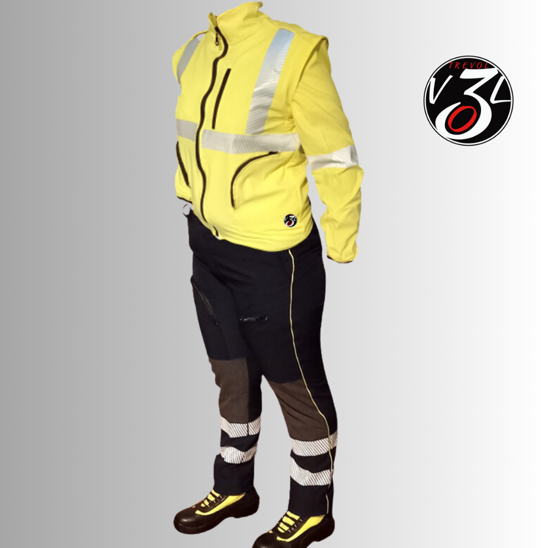 Divisa protezione civile composta da: Giubbino bielasticizzato con vestibilità slim fit per protezione civile. In poliestere stretch giallo fluo con maniche staccabili, con 4 tasche anteriori e bande rifrangenti UNI EN 20471. applicazione Logo a ricamo e scritte termosaldate. Pantalone bielasticizzato con vestibilità slim fit per protezione civile. In poliestere stretch blu navy con tasche anteriori e bande rifrangenti UNI EN 20471. coda di topo laterale giallo fluo Rinforzi alle ginocchia e bande rifrangenti UNI EN 20471.
