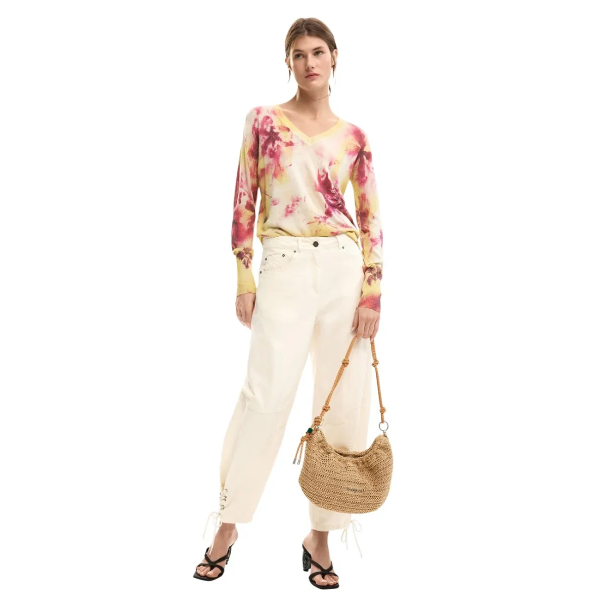Scopri il maglione donna Desigual LEGGERO A FIORI maniche lunghe 26SWJF07, il perfetto connubio tra stile spagnolo colorato e comfort quotidiano. Questo elegante maglione rosa con fantasia floreale, maniche lunghe e scollo a V in 71% viscosa, 20% poliammide e 9% poliestere รจ l’accessorio essenziale per la donna moderna che unisce design vivace e qualitร superiore.