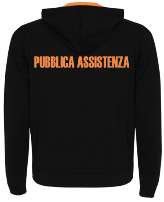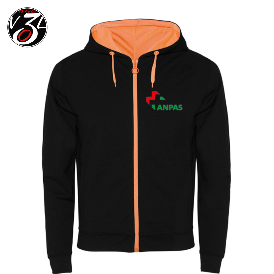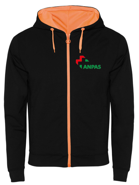 Felpa fuji Anpas in french terry con particolari in colore fluorescente. Zip centrale con tiretto ad anello a contrasto in colore fluo. Cappuccio con fodera in tessuto poliestere microforato a contrasto colore fluo, coulisse e occhielli in metallo a contrasto colore fluo. Maniche lunghe con polsini e girovita in costina 1×1. Due tasche anteriori con ampie cuciture a vista. Copri cuciture rinforzate all’interno del collo.