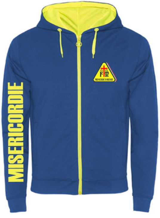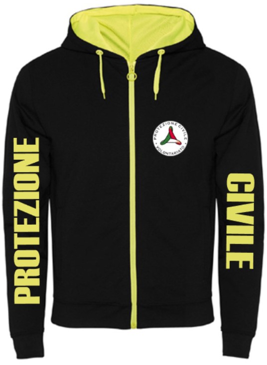 Felpa Fuji personalizzata in tessuto french terry con particolari in colore fluorescente, come la zip centrale ed il tiretto ad anello sono a contrasto in colore fluo, anche il cappuccio con fodera in tessuto poliestere microforato è in colore giallo fluo ed anche la coulisse e gli occhielli in metallo sono a contrasto di colore fluo. Inoltre le maniche lunghe con polsini e girovita sono in costina 1×1. Inoltre è fornita di due tasche anteriori con ampie cuciture a vista, con copri cuciture rinforzate all’interno del collo.