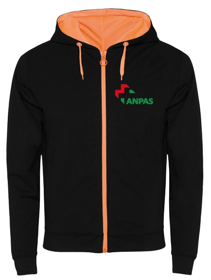 Felpa in french terry con particolari in colore fluorescente. Zip centrale con tiretto ad anello a contrasto in colore fluo. Cappuccio con fodera in tessuto poliestere microforato a contrasto colore fluo, coulisse e occhielli in metallo a contrasto colore fluo. Maniche lunghe con polsini e girovita in costina 1×1. Due tasche anteriori con ampie cuciture a vista. Copri cuciture rinforzate all’interno del collo. Logo lato cuore termosaldato