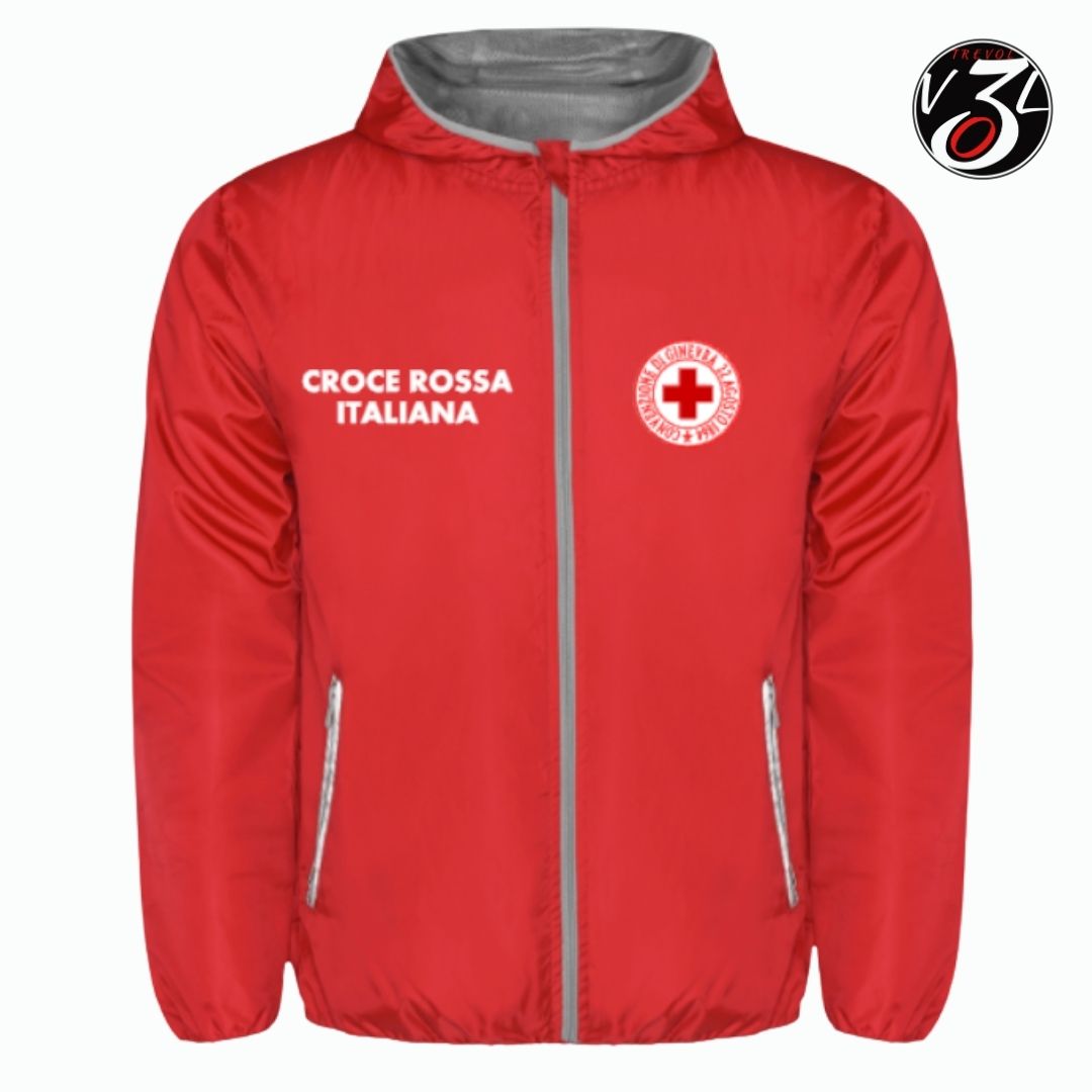 Giacca antipioggia cri con cappuccio. Tasche frontali con bordatura riflettente e tasca posteriore marsupio per racchiudere l´impermeabile, chiusura in velcro.