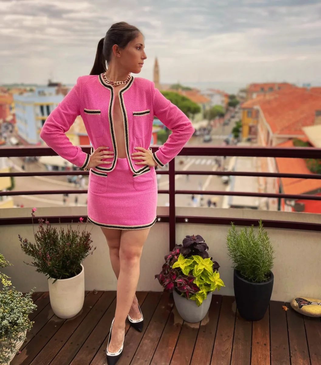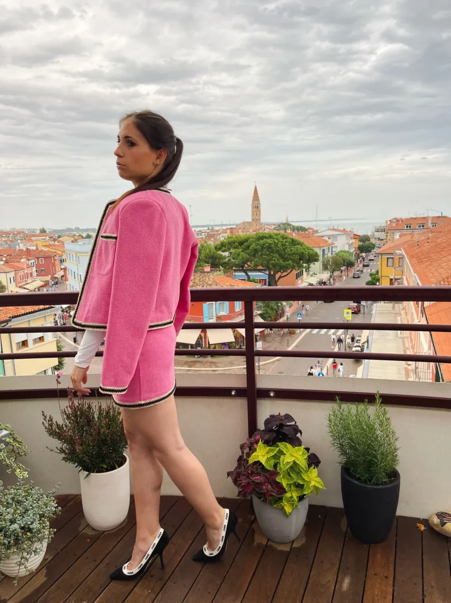 Giacca rosa in tessuto Chanel con ricami lungo il bordo e tasche.