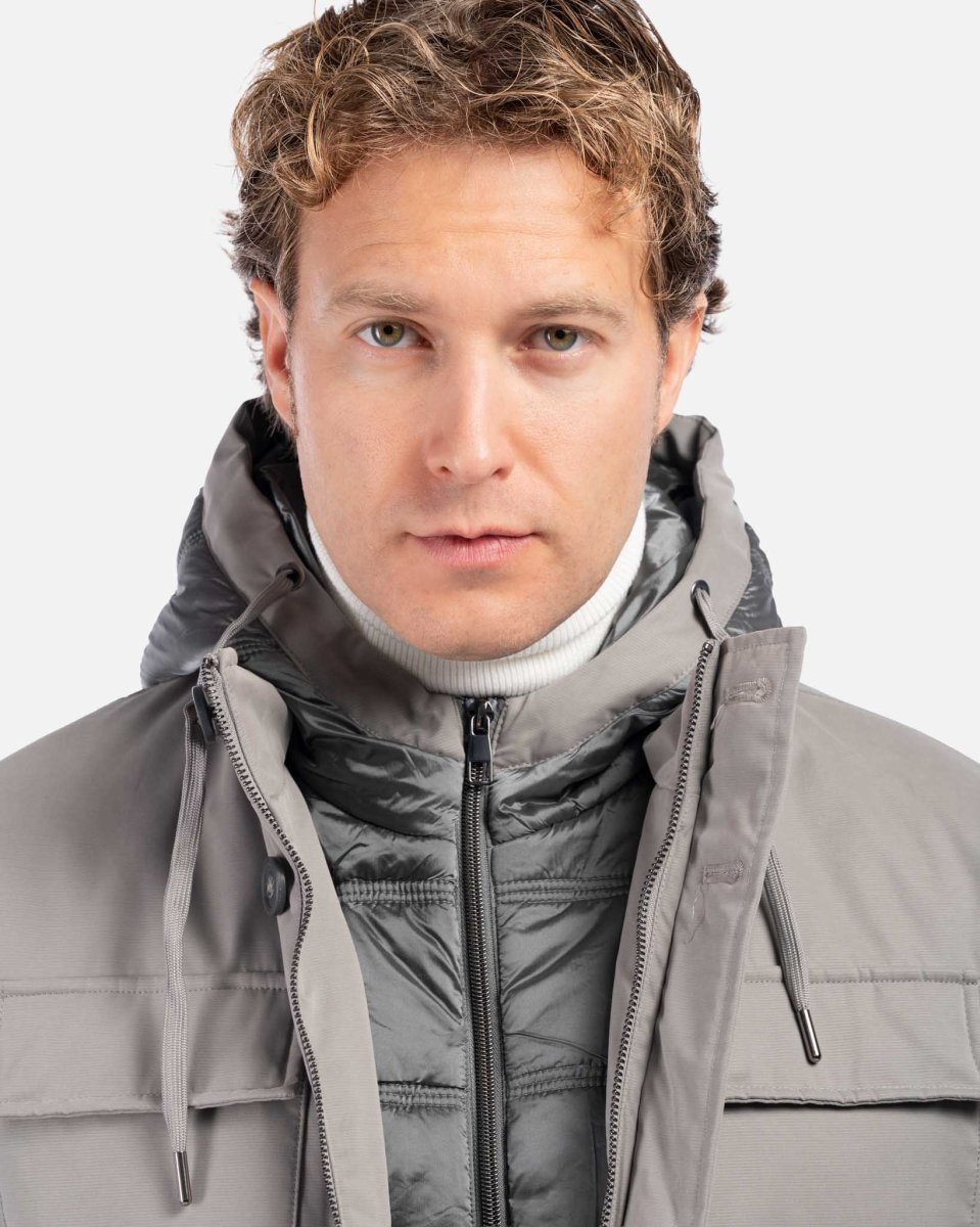 Elemento distintivo del capo è la pettorina interna con zip e cappuccio imbottito, staccabile all’occorrenza, che aggiunge un ulteriore strato protettivo e un tocco sportivo al look. Il fit è confortevole, con spalle ben definite e lunghezza media ideale sia per l’uso urbano che per gli spostamenti outdoor.
