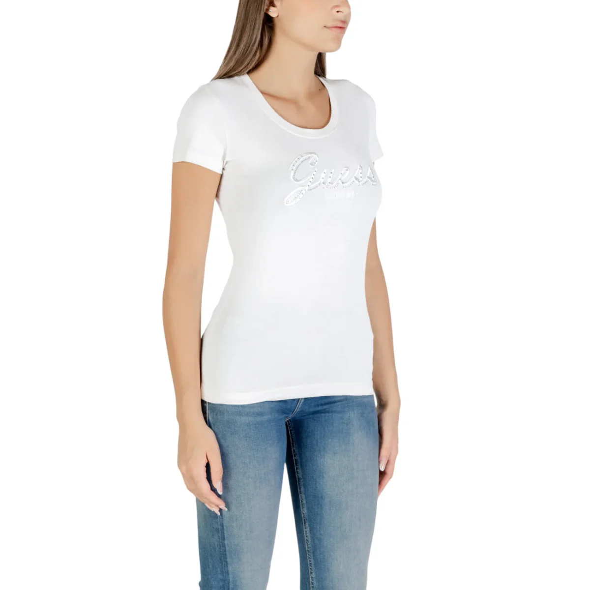 ๐ค T-Shirt Donna Guess EMBRO SCRIPT LOGO Maniche Corte Bianca con Strass Scollo Tondo 95% Cotone 5% Elastan Autunno/Inverno – Stile Americano Glamour