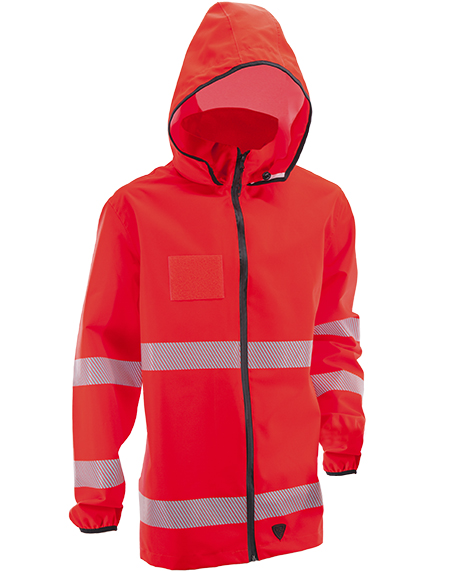 Guscio idrorepellente / kway, ampio cappuccio a scomparsa nel collo. Elastico autoregolante sui polsi e coulisse interna inferiore. Chiusura frontale a mezzo cerniera acquastop. Due tasche inferiori verticali, chiuse da cerniera acquastop. Bande rifrangenti segmentate termoapplicate. VESTIBILITA’ SLIM FIT.