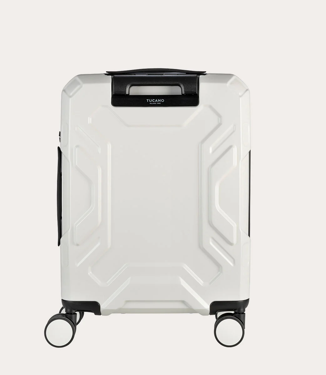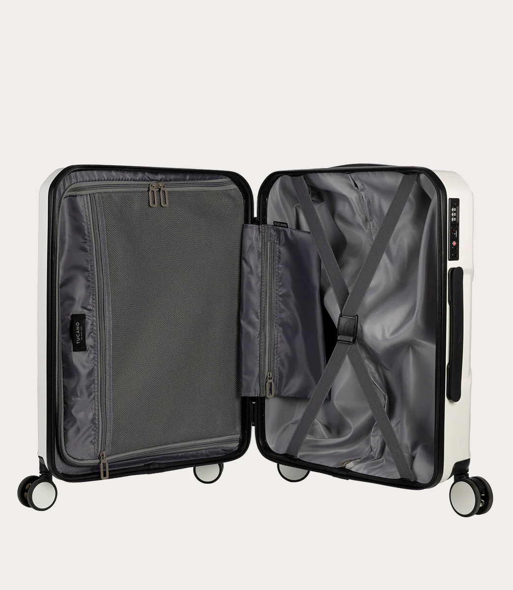 Trolley da cabina a quattro ruote Trolley da cabina a quattro ruote dal design industriale, caratterizzato da due scocche in policarbonato leggero e resistente. L’ampio spazio interno, ha un separatore in tessuto con cerniera, dotato di comode tasche, e una doppia cinghia per fissare gli indumenti. Chiusura TSA.
