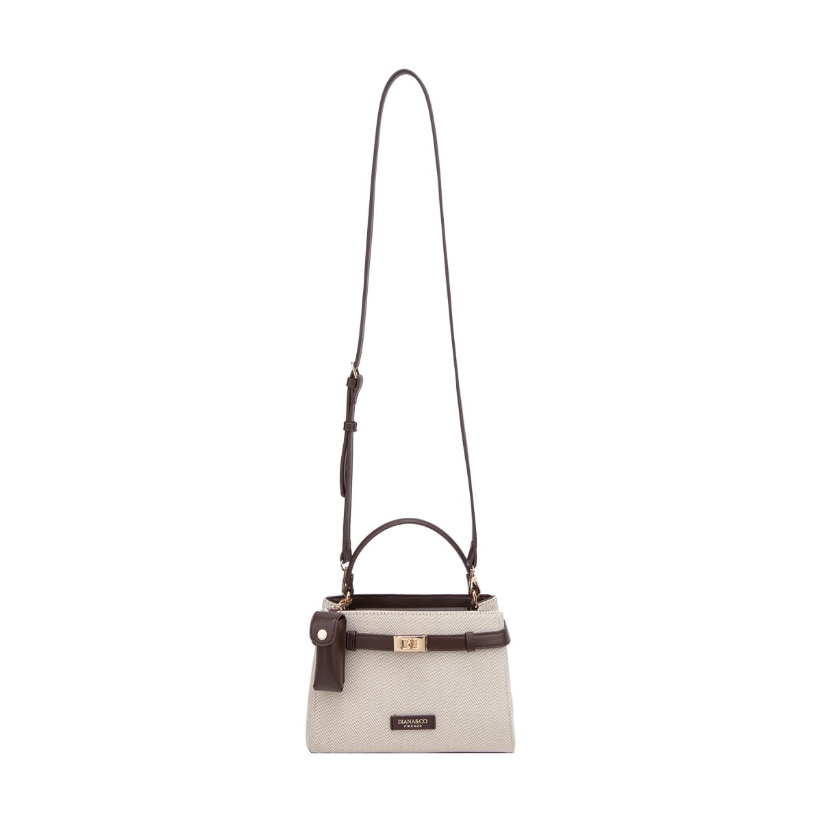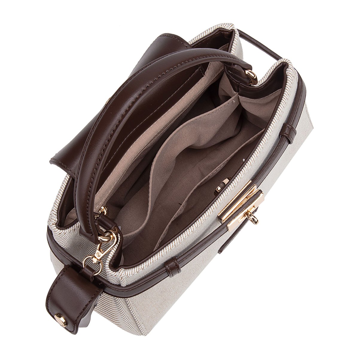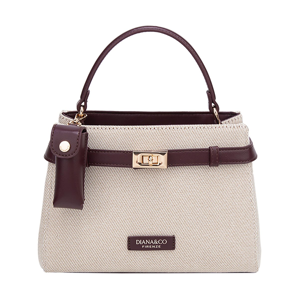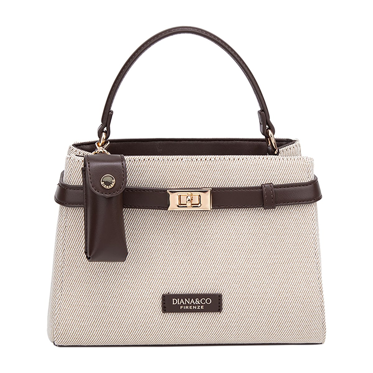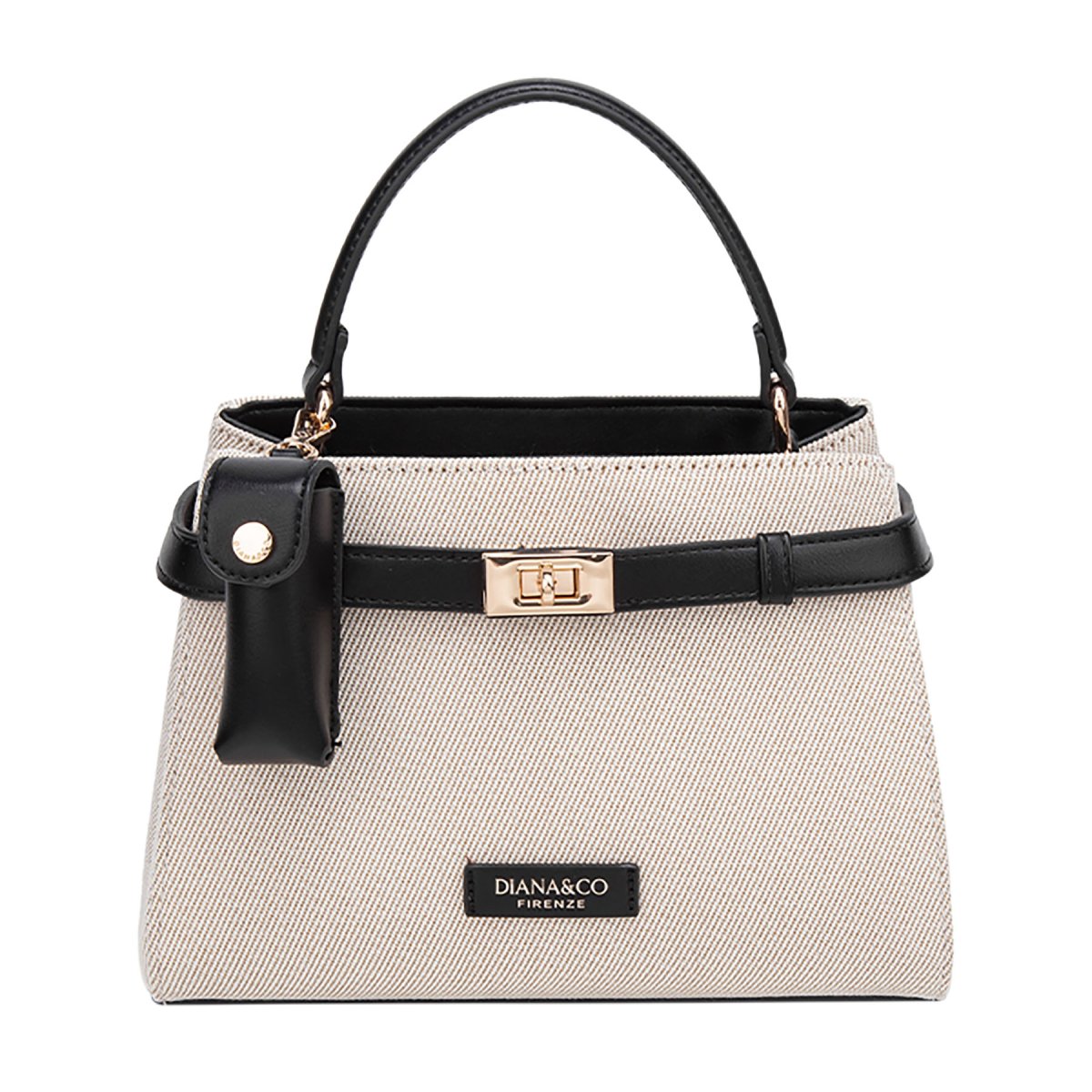 Borsa a mano in canvas beige e similpelle. Dotata di elegante chiusura a girello dorata, si distingue per l’esclusivo porta lipstick coordinato agganciato al manico, unendo stile classico e praticità femminile.