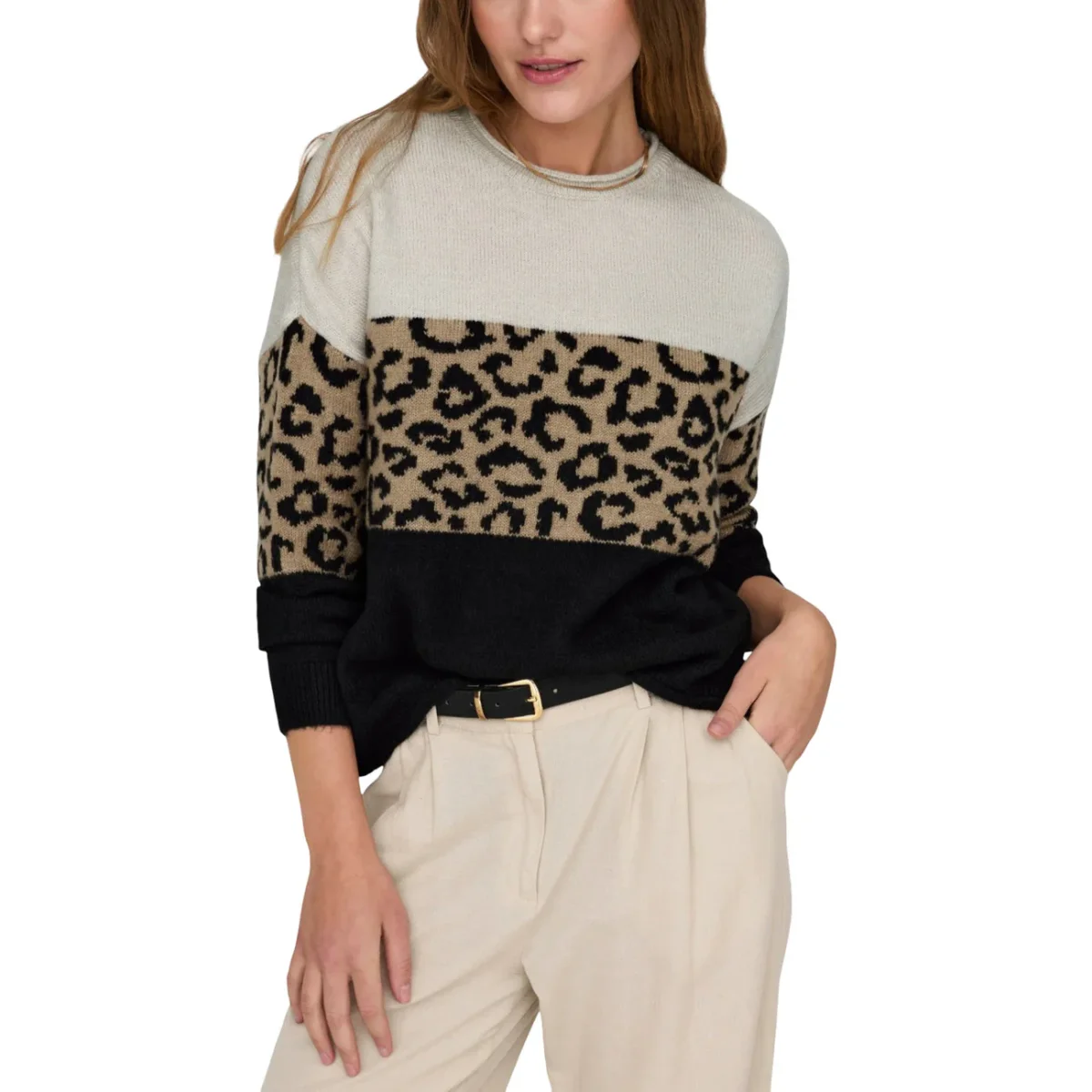 โจ Only Maglione Donna Beige Leopardato Maniche Lunghe Scollo Tondo – Stile Scandinavo Trendy