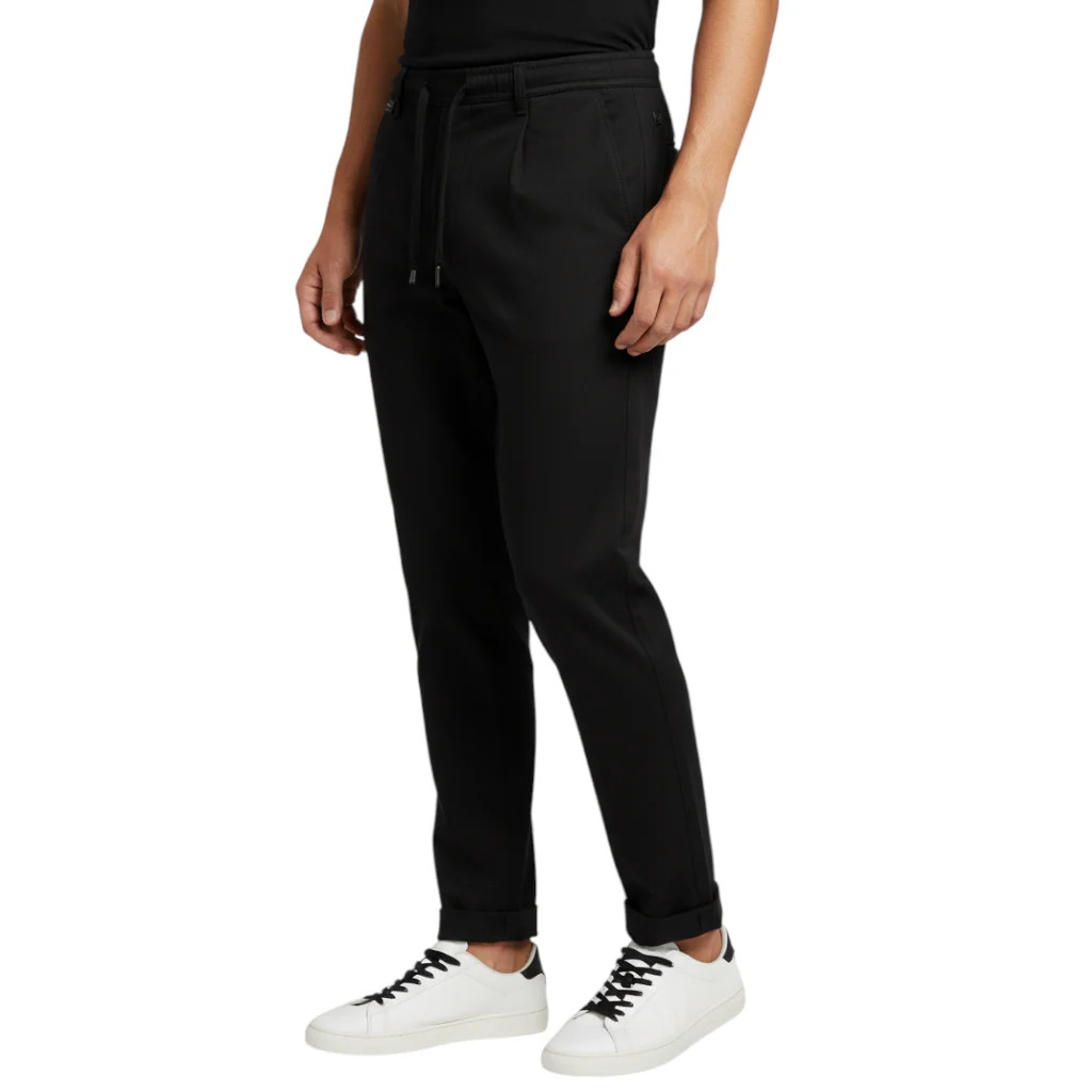 Pantalone uomo BIKKEMBERGS con lacci punto Milano Nero Elastico retro vita Chiusura bottoni e cerniera Svoltini Tasche laterali 65% Viscosa 30% Pollamide 5% Elastico Tasche diagonali Vestibilitร regolare Elasticizzato
