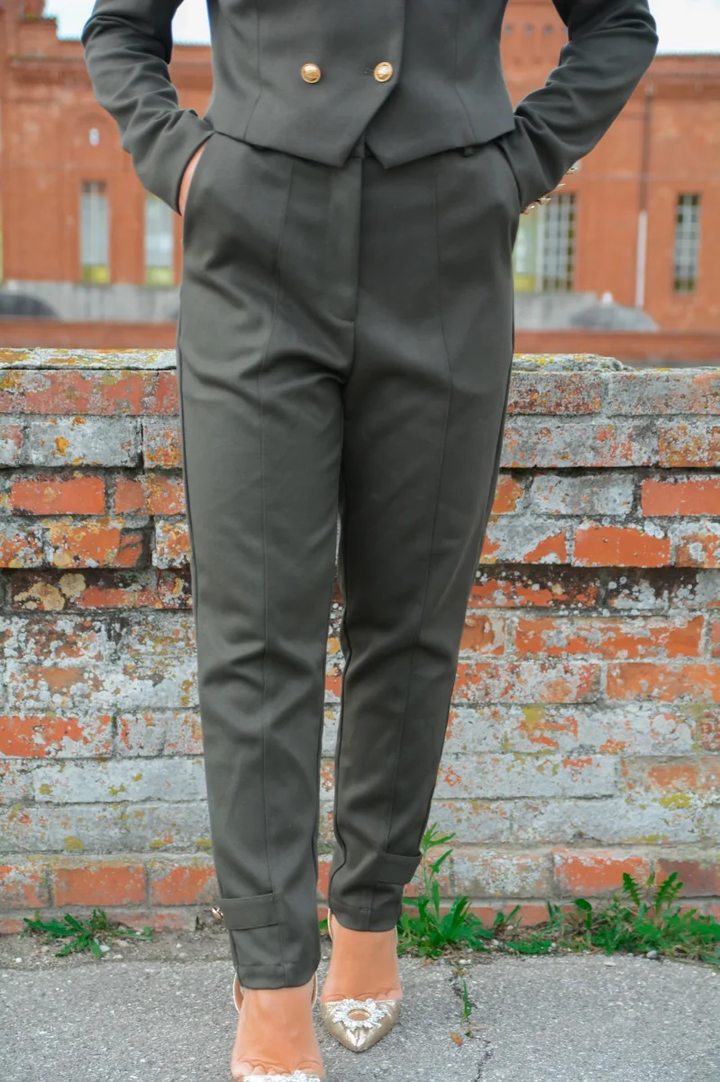 Pantaloni dal taglio dritto verdi militari, un capo di abbigliamento dal look ricercato ed esclusivo. Caratterizzati da una linea semplice ed un bottone sulla caviglia, danno un tocco sartoriale ed originale al tuo outfit. La modella indossa taglia S.