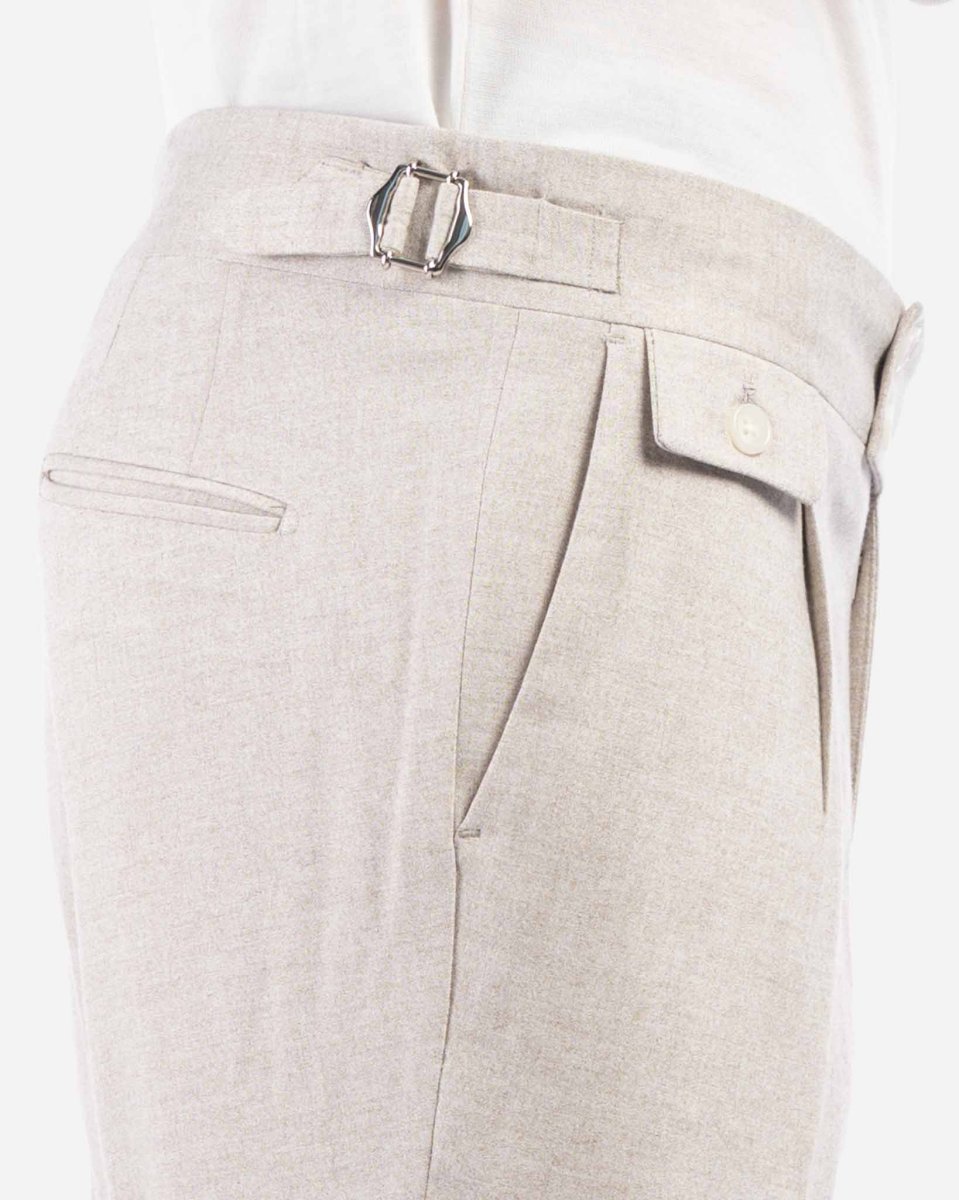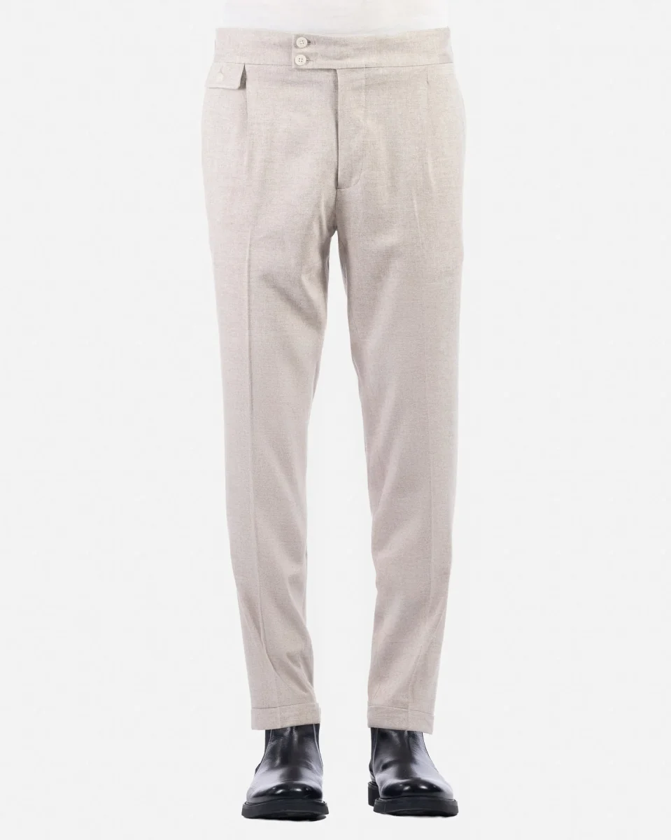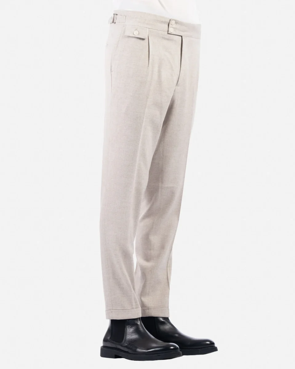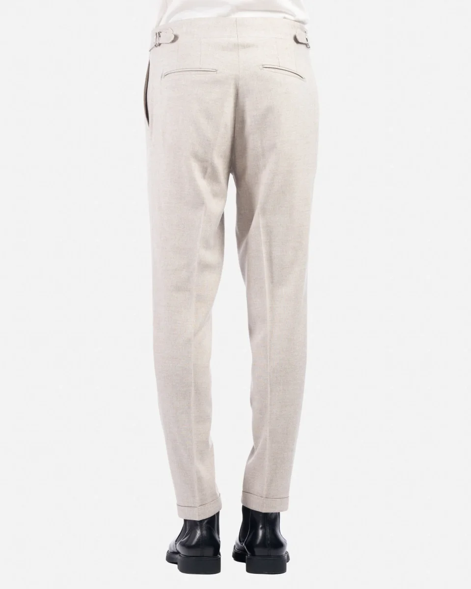 Pantaloni eleganti realizzati in flanella leggera dalla mano morbida e dall’aspetto raffinato. La texture leggermente mélange e la linea asciutta con piega stirata li rendono perfetti per un abbigliamento formale moderno o per look più disinvolti ma curati. Il design con doppia pinces, cinturino laterale regolabile con fibbia in metallo e patta con doppio bottone conferisce un tocco sartoriale e funzionale.