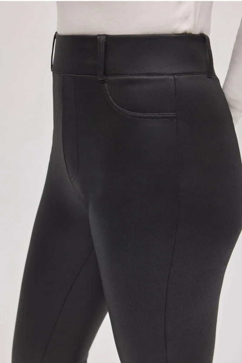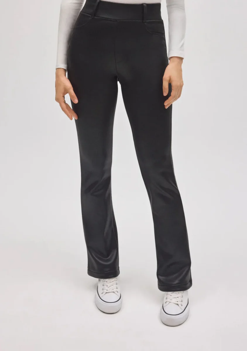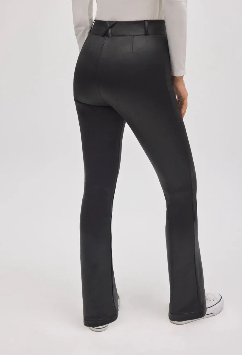 Pantaloni neri elasticizzati effetto pelle a zampa d’elefante