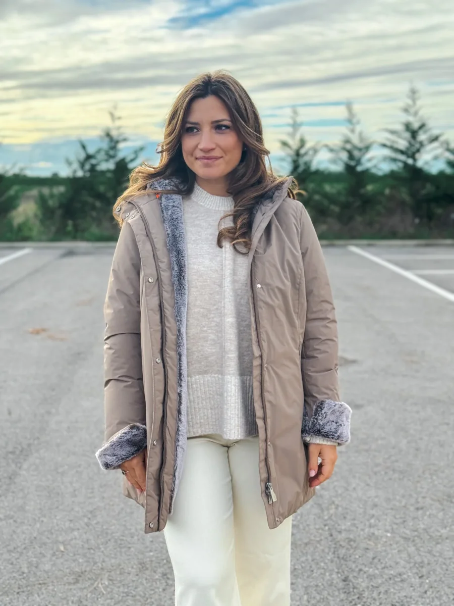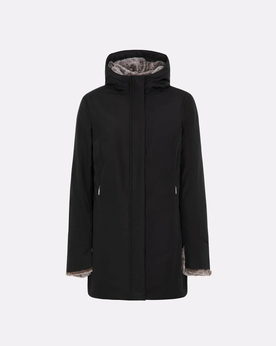 - Cappuccio con bordo in pelliccia sintetica staccabile.