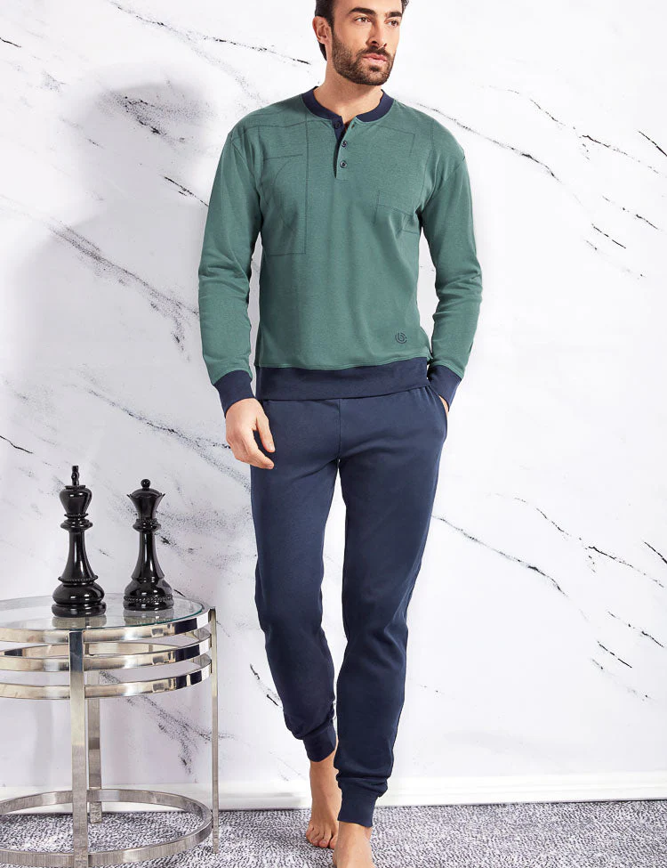 Pigiama in caldo cotone, perfetto per le serate fredde. Il tessuto e’ morbido e confortevole, con una texture delicata al tatto che dona calore senza risultare pesante. Pantalone con vita elastica e polsini sul fondo. Composizione : 100%cotone