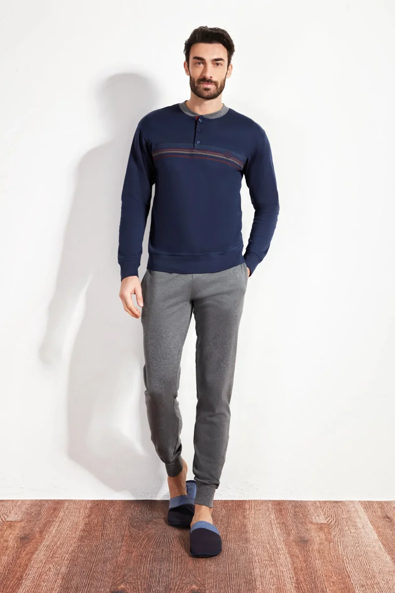 Questo pigiama da uomo in caldo cotone e’ la scelta ideale per lÉautunno e lÉinverno. Il tessuto, morbido e leggermente felpato allÉinterno, garantisce una piacevole sensazione di calore senza rinunciare alla traspirabilita’. Composizione : 100%cotone