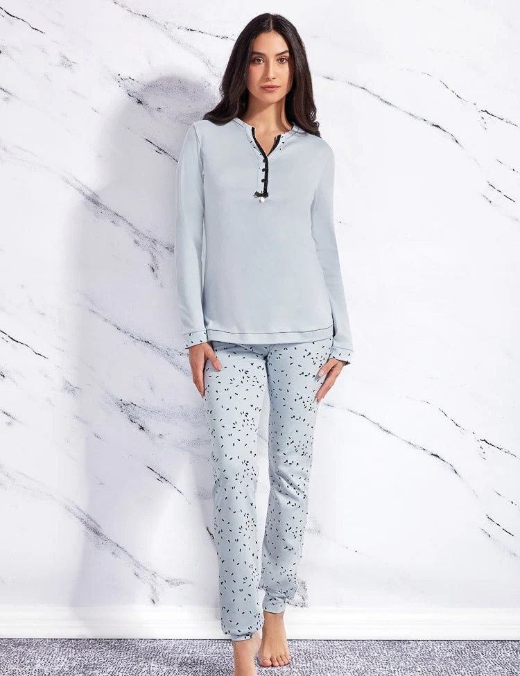 Un pigiama in caldo cotone per donna e’ l’ideale per le serate fresche, offrendo comfort e calore. La maglia ha una vestibilita’ morbida e scollo a V con 3 bottoni. I pantaloni sono realizzati in caldo cotone morbido con elastico in vita per una vestibilita’ comoda. Composizione : 100%cotone