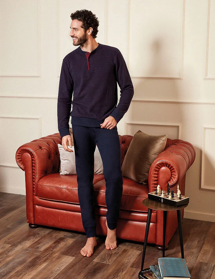 Serafino 3 bottoni manica lunga con polsini sul fondo della manica, pantalone lungo con polsini. Realizzato in morbido e caldo jacquard, assicura comfort durante il sonno o il relax in casa. Composizione : 50%cotone-50%poliestere