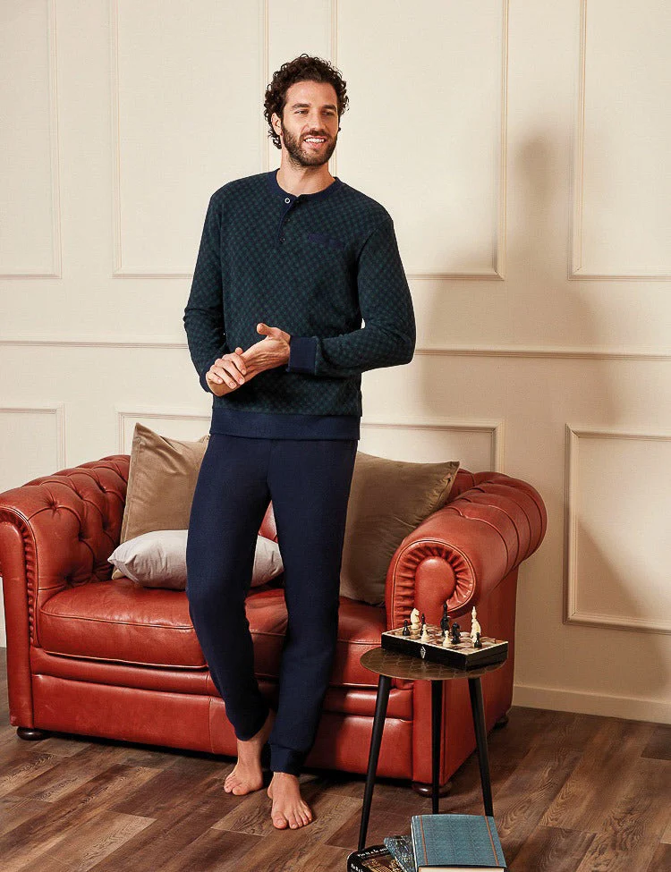 Serafino 3 bottoni manica lunga con polsini sul fondo della manica, pantalone lungo con polsini. Realizzato in morbido e caldo jacquard, il pigiama offre comfort durante il sonno o il relax a casa. Composizione : 50%cotone-50%poliestere