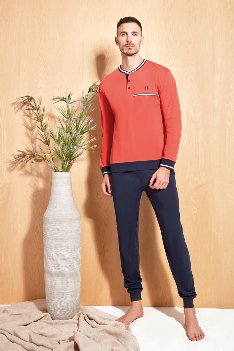 Un pigiama da uomo modello Serafino in cotone e’ la scelta ideale per chi cerca comfort e stile senza rinunciare alla praticita’. Questo modello si distingue per la sua maglia a maniche lunghe con abbottonatura parziale a tre bottoni. Composizione : 100%cotone