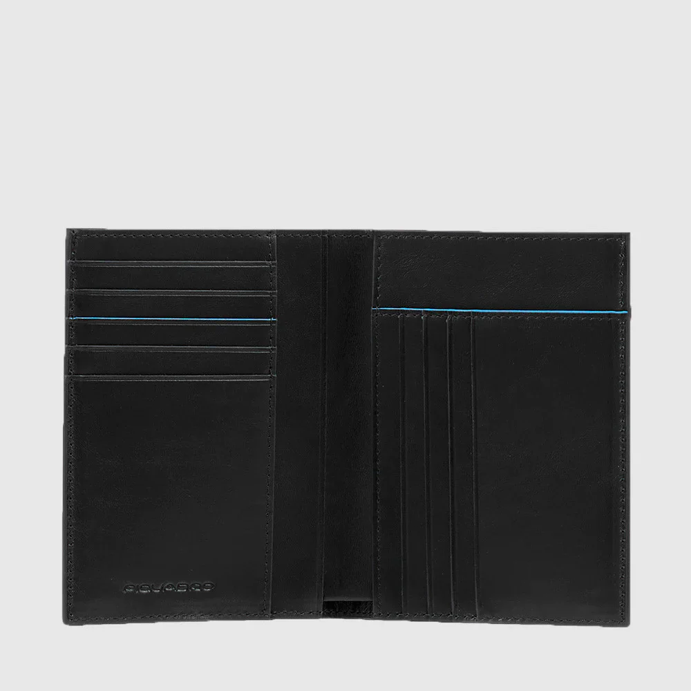 Portafoglio uomo verticale con 9 slots per carte di credito, 4 spazi per documenti e tascone per banconote. Le fodere sono dotate di sitema antifrode R-FID .