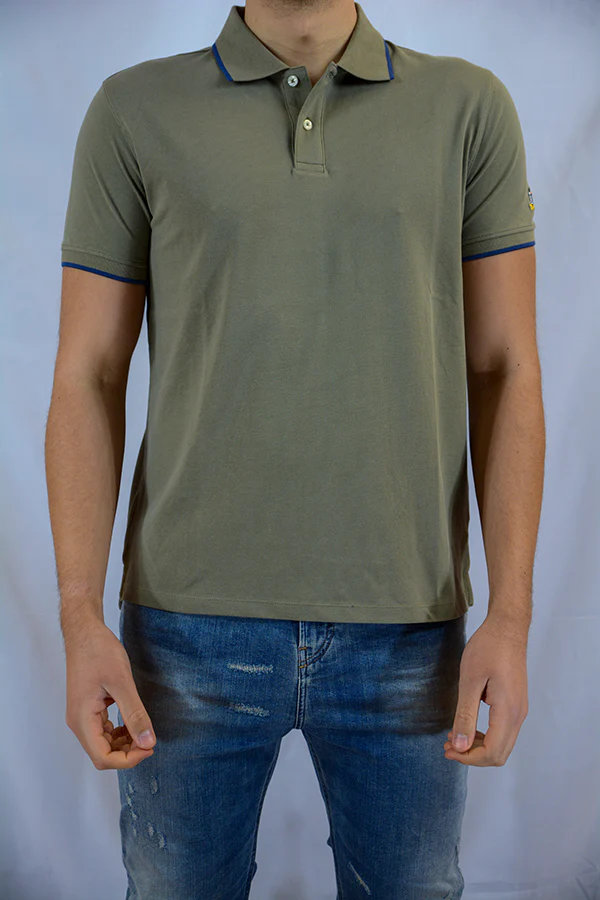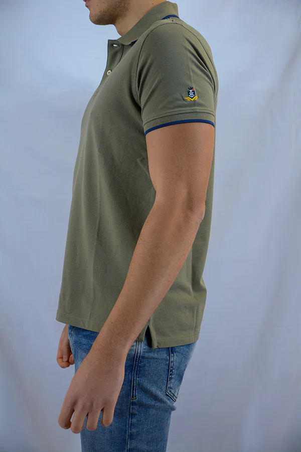 Polo uomo manica corta, in piquet 100% cotone. Collo in costa in tinta con contrasti colore blu. Polsi in costa in colore contrasto blu. Ricamo in tinta su manica sinistra.