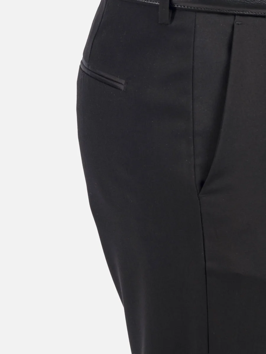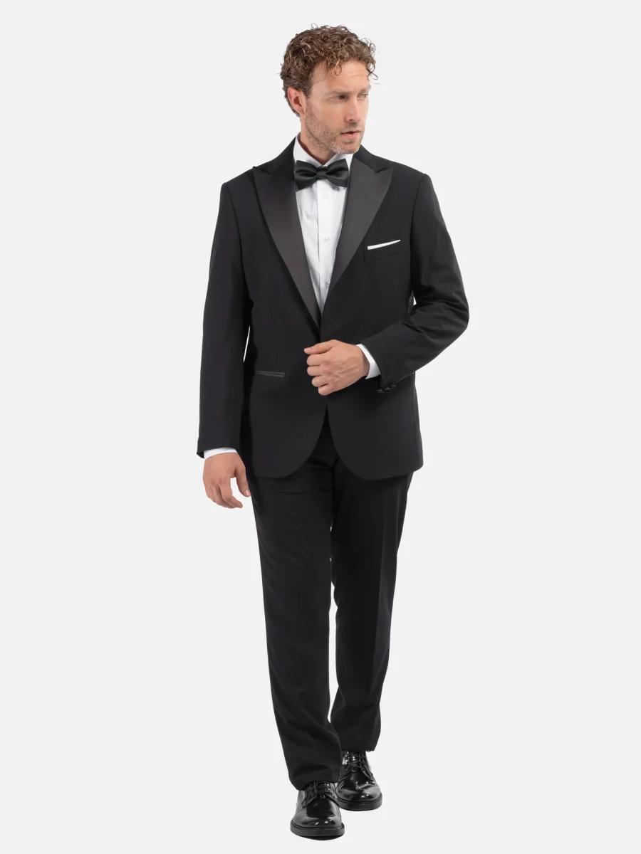Eleganza senza tempo in una silhouette impeccabile: questo smoking monopetto si distingue per la sua mano fluida e la luminosità naturale del tessuto. Il rever a lancia in raso di seta crea un sofisticato contrasto opaco/lucido, esaltando la linea essenziale della giacca. Il taglio è regolare, con costruzione leggera e spalle appena accennate, pensato per garantire comfort e precisione sartoriale. Le tasche a filetto con profilo in raso e i bottoni rivestiti completano il design pulito e formale. I pantaloni presentano una tasca a filetto sul retro con profili in raso. Un capo ideale per serate formali, cerimonie e inviti black tie.
