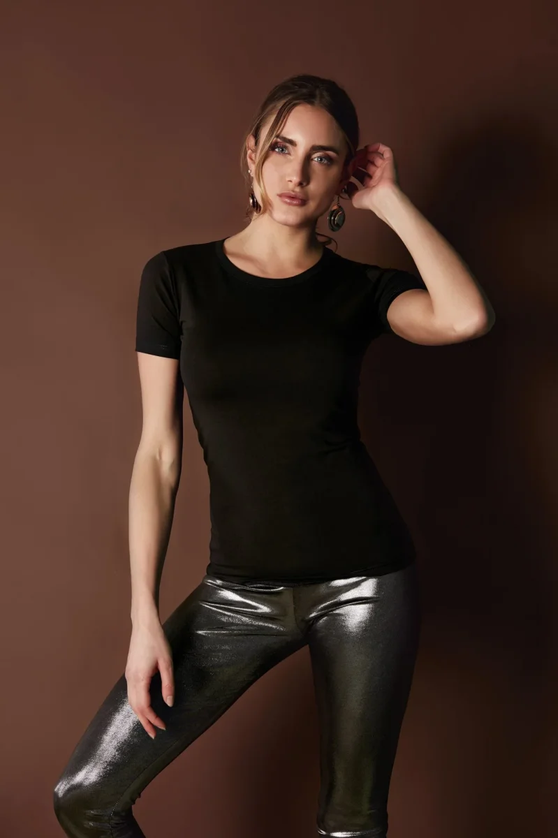 Una t-shirt donna a manica corta in bielastico e’ un capo basico e aderente, realizzato in tessuto elasticizzato in due direzioni che garantisce comfort e liberta’ di movimento. Semplice e versatile, si abbina facilmente a outfit casual o piu’ curati. Composizione : 93%cotone-7%elastan