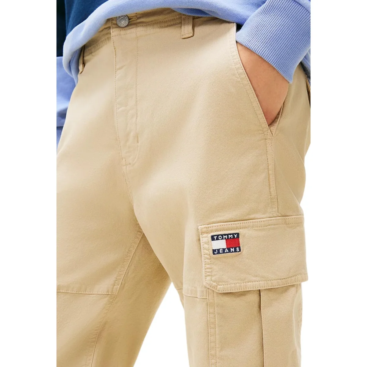 Scopri i pantaloni uomo Tommy Hilfiger Jeans cargo Sonny affusolati in tela DM0DM22651, il perfetto connubio tra stile americano iconico e comfort quotidiano. Questi eleganti pantaloni beige cargo affusolati in tela con zip, bottone e tasche anteriori e posteriori in 97% cotone organico e 3% elastan sono l’accessorio essenziale per l’uomo moderno che unisce design leggendario preppy e qualitร superiore.