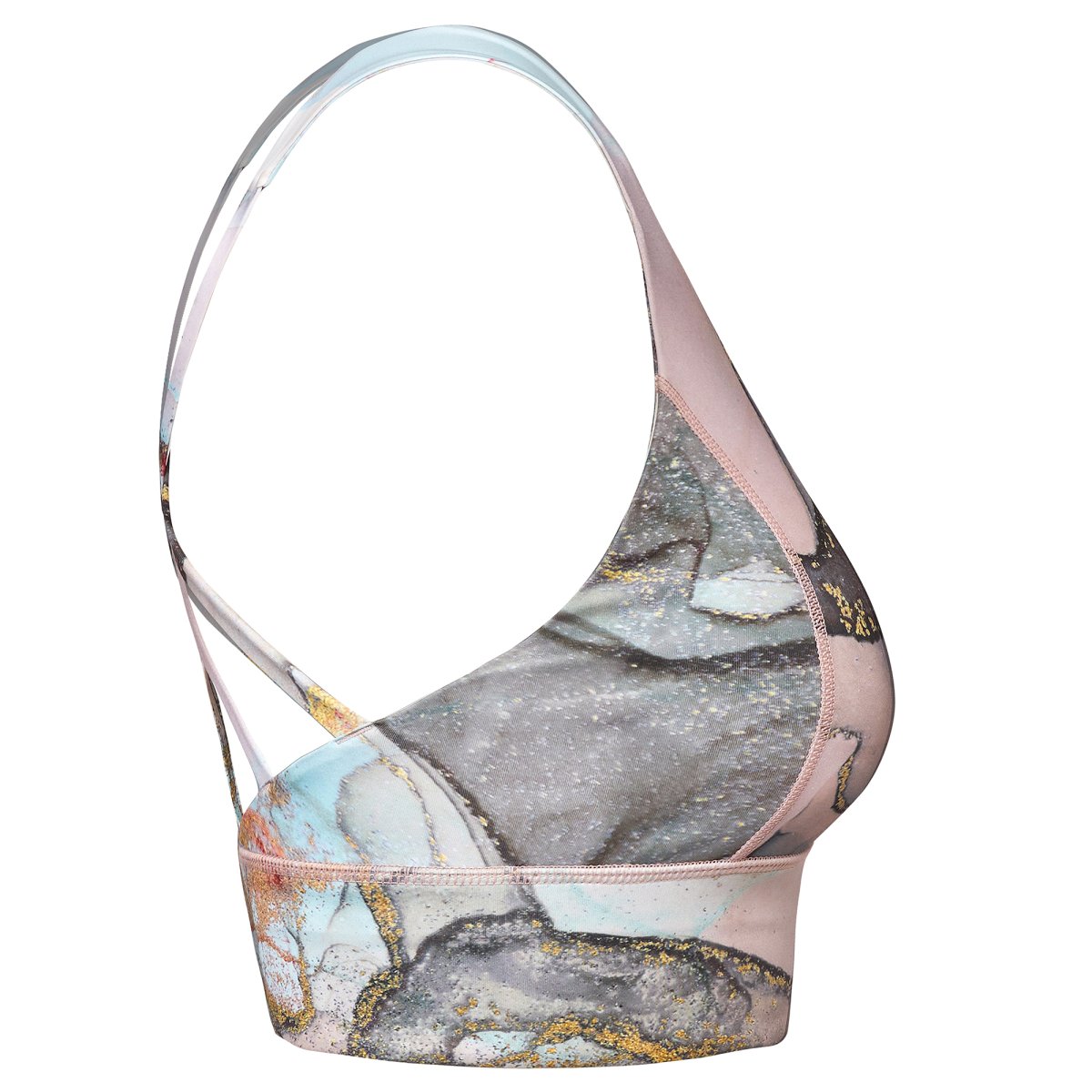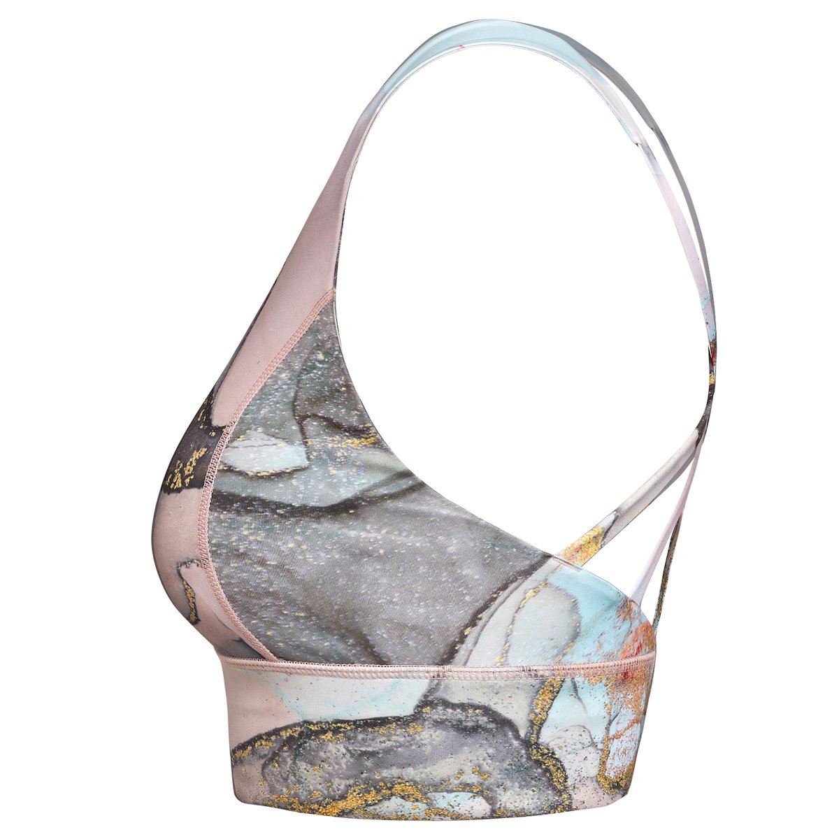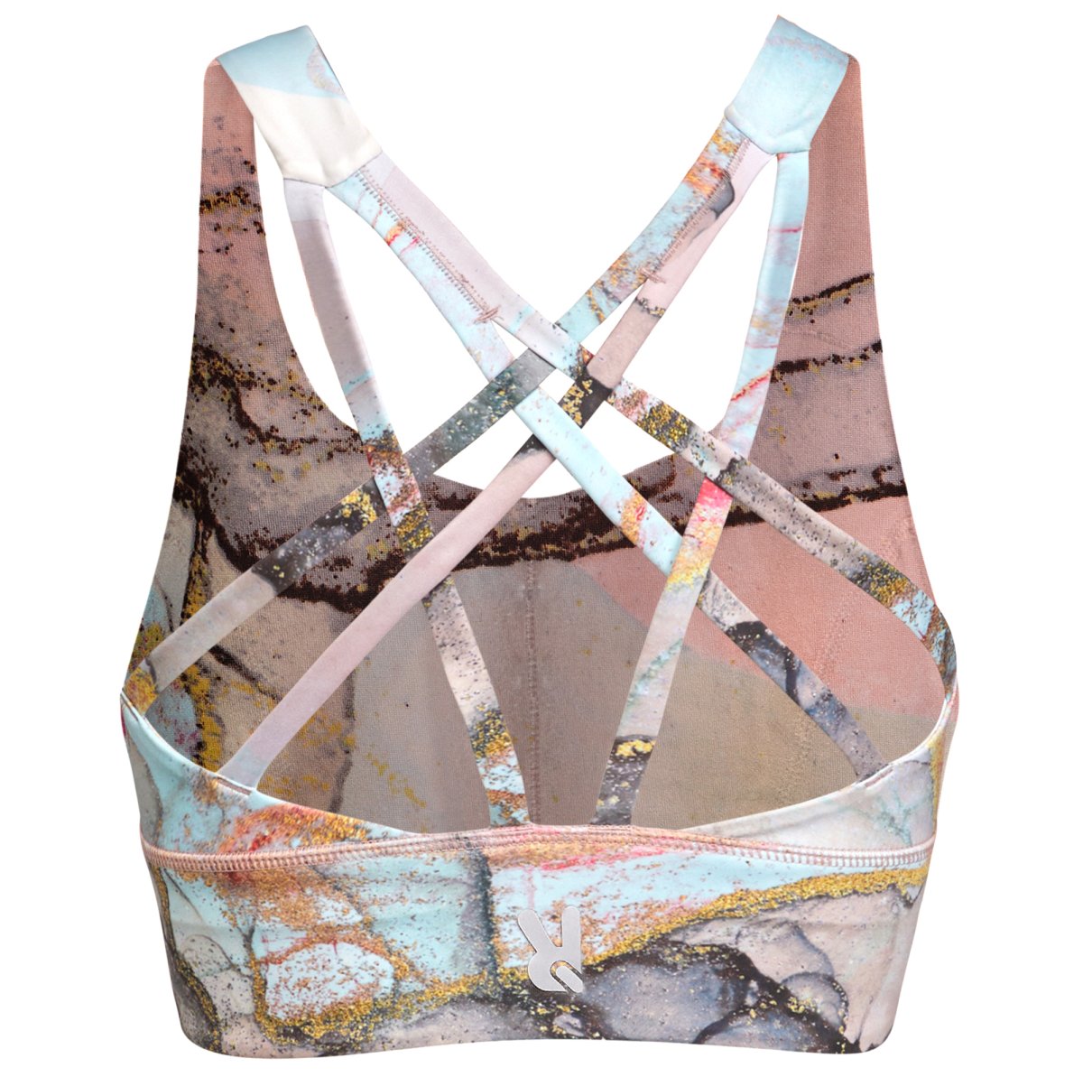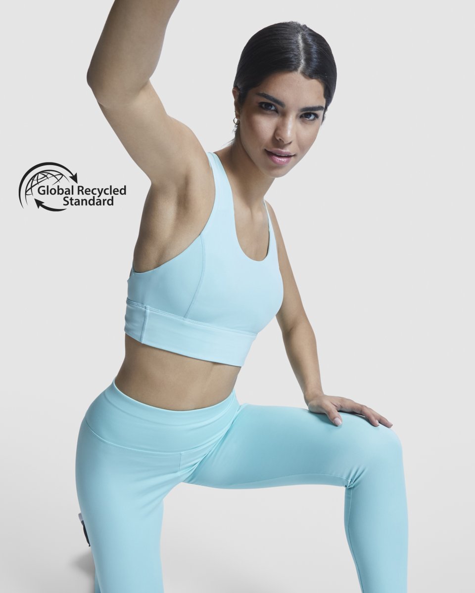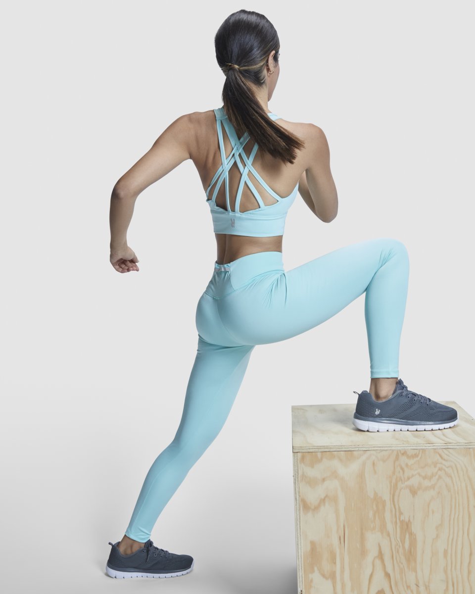 Top sportivo ad alto sostegno. Cinghie posteriori intrecciate. Banda elastica di rinforzo sotto il petto. Tessuto doppio e foderato. Coppe in schiuma rimovibili. Logo riflettente sul retro.