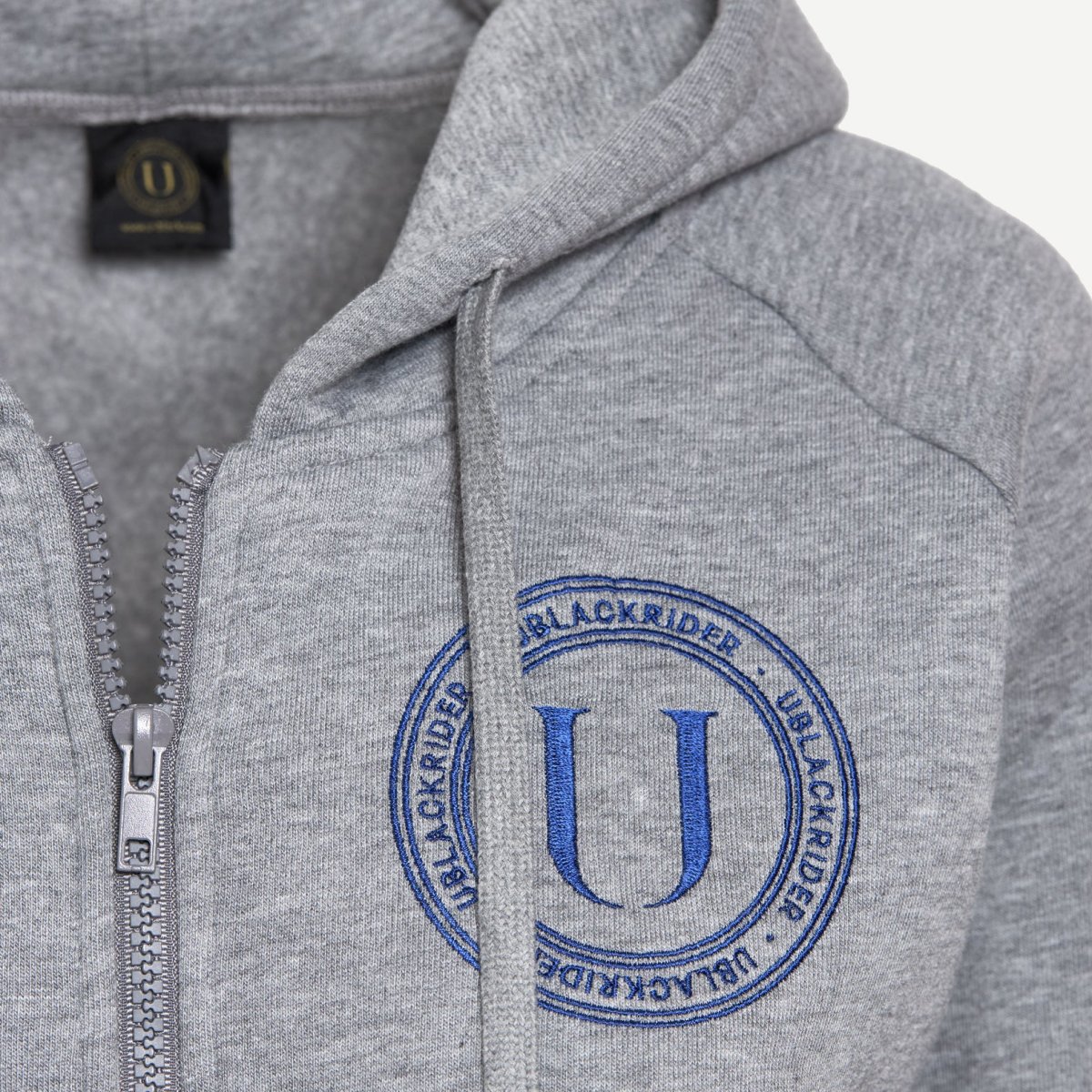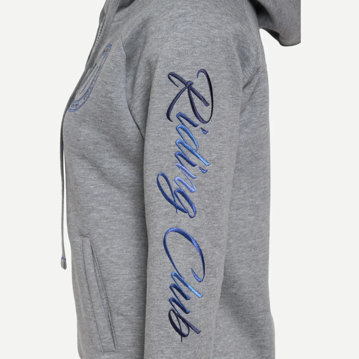 Felpa grigia in cotone felpato con cappuccio e coulisse regolabile. Tasche sul davanti e logo ricamato con filo color bluea cuore. Ricamo “Riding Club” nelle sfumature dei blue sulla manica. Realizzata in Italia.