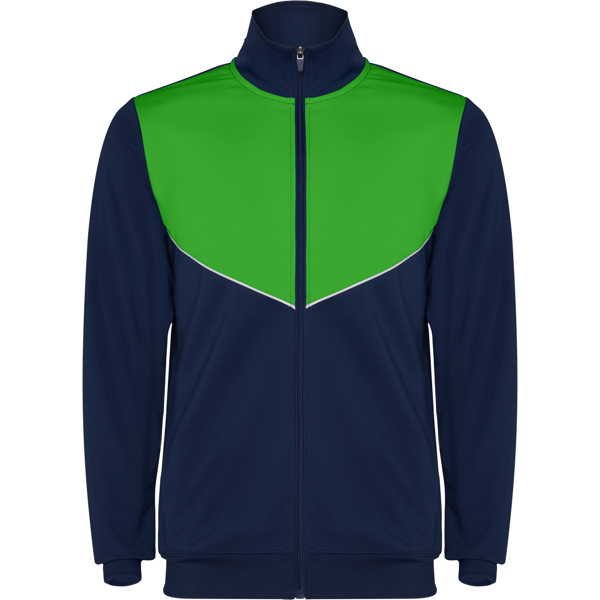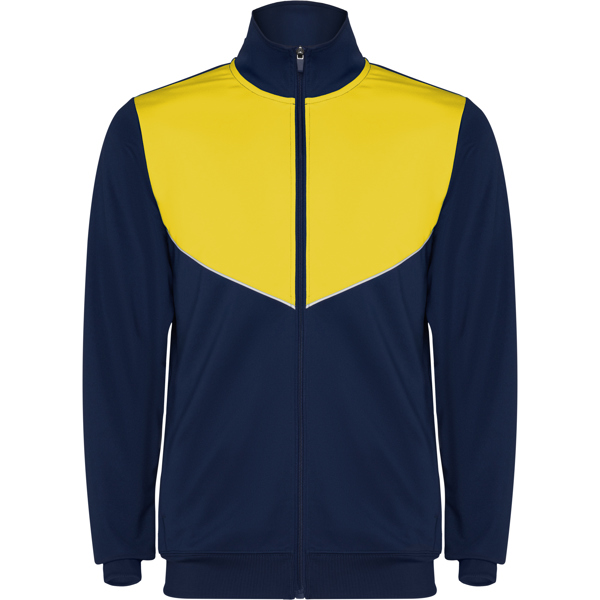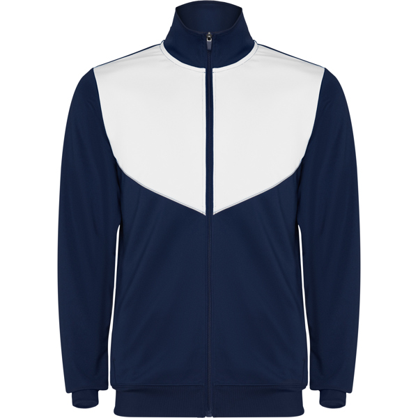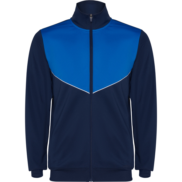 Tuta da ginnastica in leggero tessuto elasticizzato con giacca con colore a contrasto e cucitura sul petto e collo alto con cuciture a contrasto, tasche laterali con cerniera e polsini e vita a costine 2×2. Pantaloni con vita elastica e cordoncino, banda laterale a contrasto, orlo con cerniera.