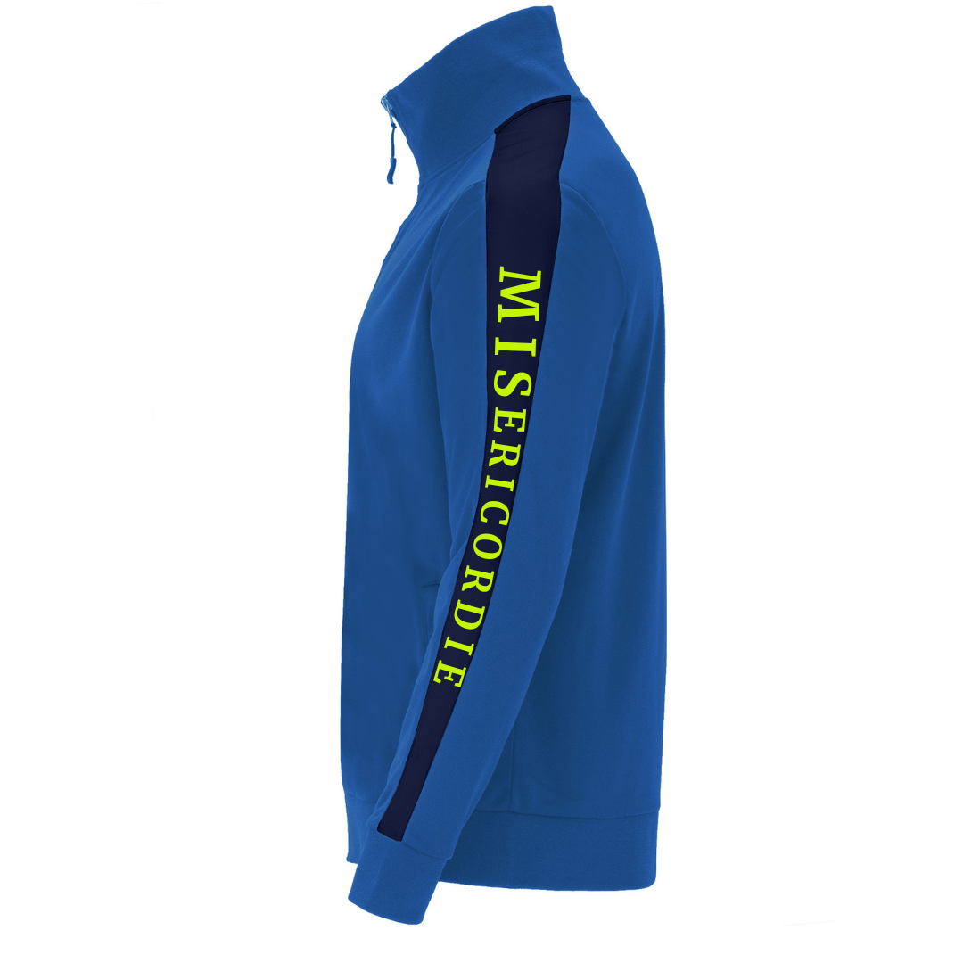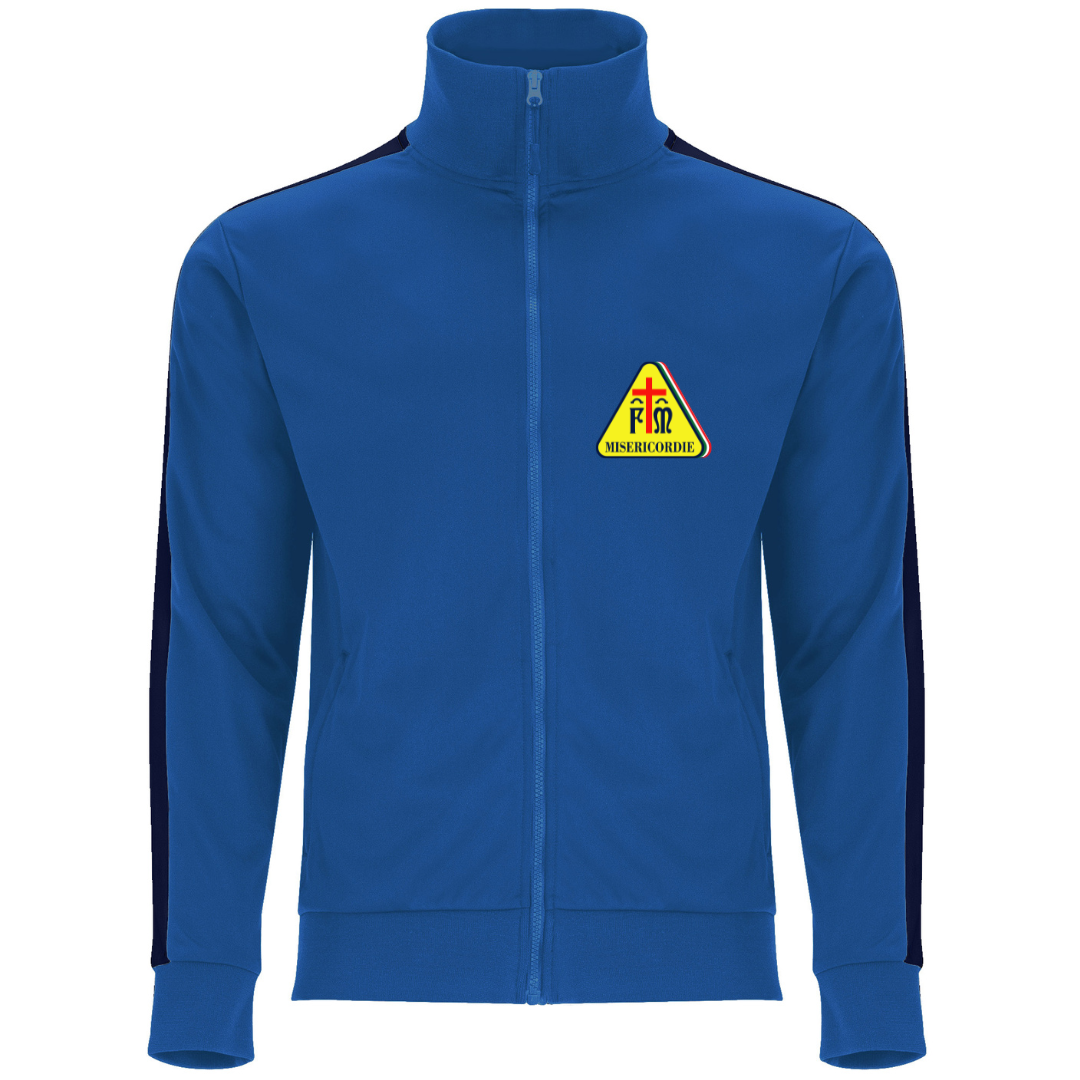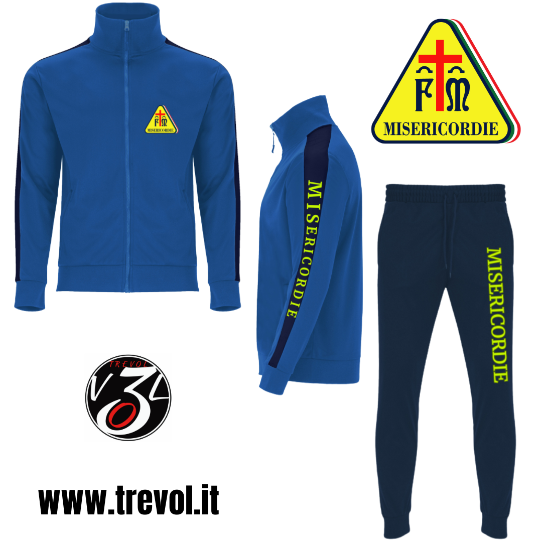 Tuta da passeggio Misericordie composta da giacca blu royal e pantalone blu navy, con inserti a contrasto, loghi e scritte termosaldati.