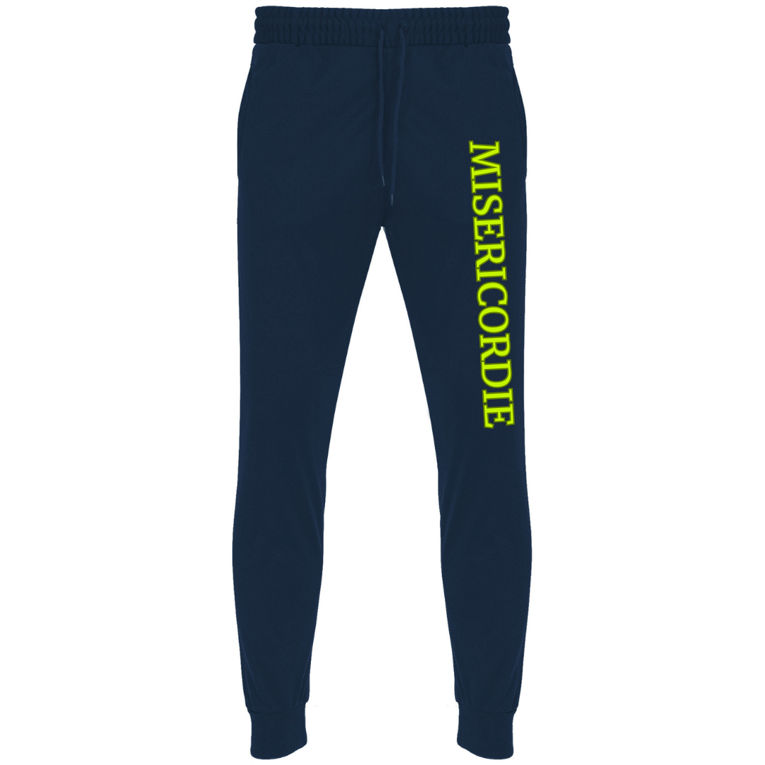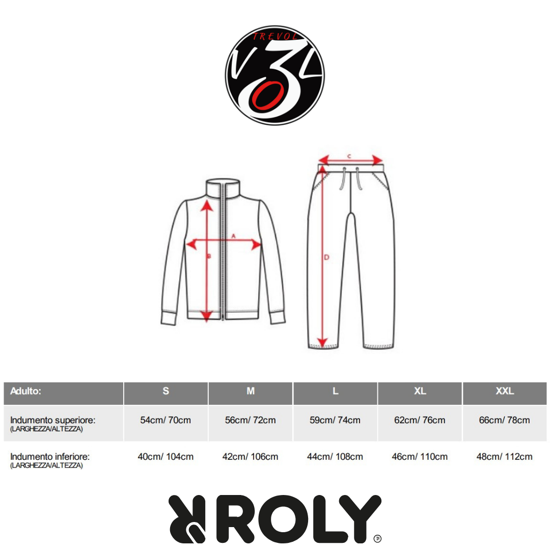 Tuta da passeggio Misericordie composta da giacca e pantalone. Giacca con collo alto con copri cuciture interne in tinta, collo, polsini e girovita in costina 1×1, cerniera centrale in tinta con tiretto, tasche laterali della giacca con cerniera e fascia laterale in contrasto. Pantalone con girovita elastico e cordoni regolabili, due tasche laterali, tasca posteriore con cerniera, con caviglie elasticizzate in costina 1×1.