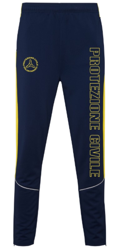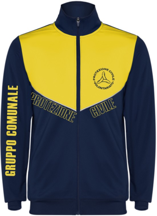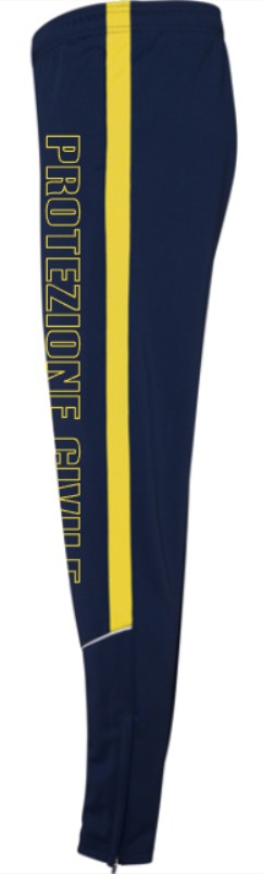 Tuta da passeggio PC composta da giacca bicolore giallo/blu navy e pantaloni blu navy con striscia gialla sul fianco, loghi e scritte termosaldati.
