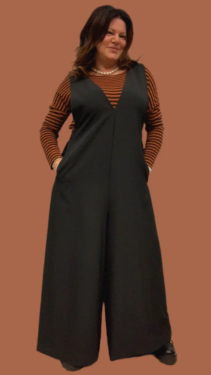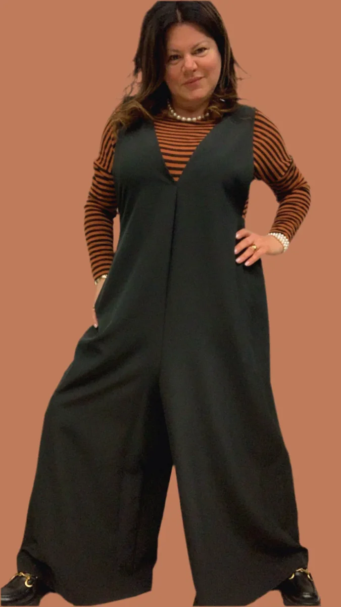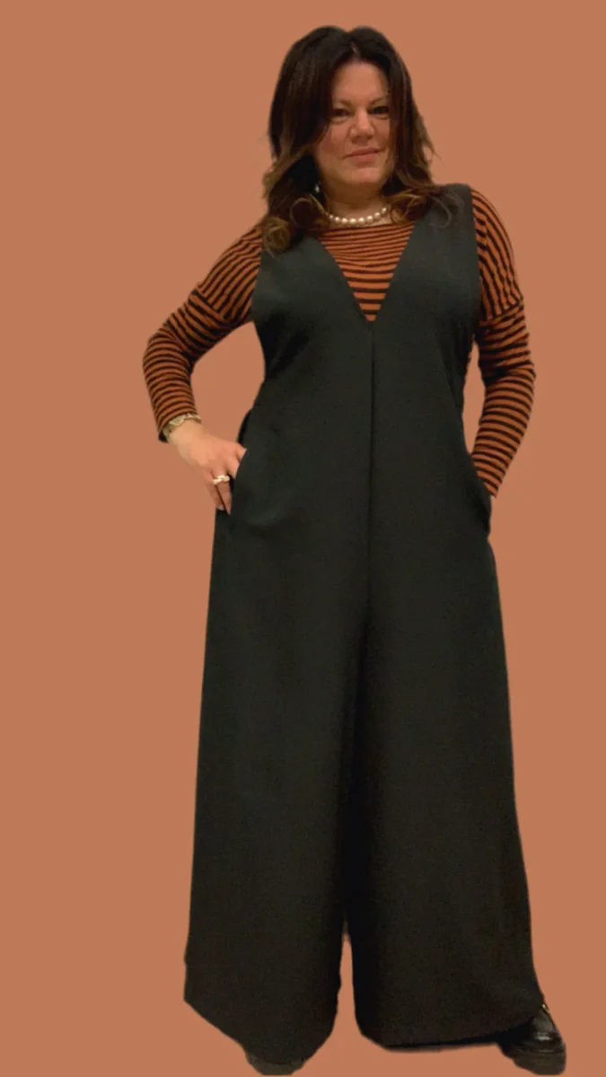 Tuta con pantalone palazzo ,taglia unica con vestibilitร comoda 44/M-XXL/50 tessuto leggermente elasticizzato 89%poliestere 11% elastan